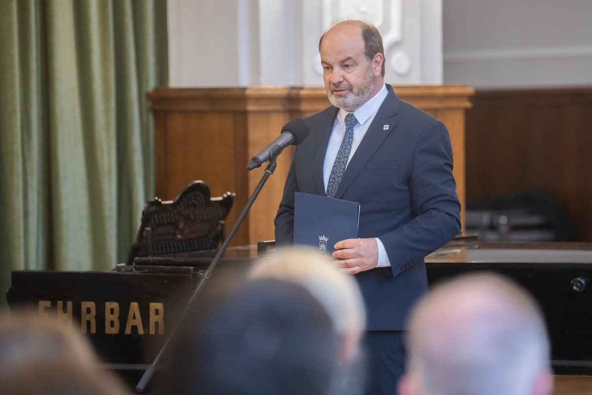 Az est harmadik díjazottja Endl László, akinek sokrétű, a zenéhez és a fehérvári zenei élethez ezer szállal kötődő tevékenységét Tóka Szabolcs orgonaművész, karnagy, tanár méltatta. Mint elhangzott, a díjazott az egykori Ének-Zenei Általános Iskolában tanult, itt kezdett zongorázni is, majd végül a továbbtanuláskor mégis a műszaki pálya felé fordult. „A zene szeretete azonban mindvégig megmaradt életében. Sőt, a zene aktív művelése is, hiszen mint kitűnő zongorista, már a ’70-es évektől rendszeresen kapott zongorakísérői felkéréseket.” Pályája a rendszerváltozás éveiben új irányt vett, előbb egy a hazai hangszergyártás és –forgalmazás területén megjelent új igények kiszolgálására létrejött cég, majd a sokak által ismert ALLEGRO hangszer- és zeneműbolt vezetője lett. Tóka Szabolcs kettejük barátságát az első, 1986-os találkozástól idézte fel, hangsúlyozva, hogy már akkor felfigyelt Endl László briliáns zongorajátékra,. „Az informatika és a számítástechnika óriási tempóban fejlődött, és ez hamar elérte az élet többi területe mellett a zeneoktatást is. Hangtechnika, stúdiómunka, számítógépes alkalmazások az alap- és középfokú művészeti oktatásban – mindezekről gyakran értekeztünk.” – így lett az új tantárgy oktatója több mint egy évtizeden át a Zeneiskolában. „Mérnöki, tanári, előadóművészi, kultúraformáló kereskedelmi, zeneszerzői és egyházzenei szakmai munkáját is az alaposság, az igényesség, a műszaki pontosság és a művészi tisztaság jellemzi. Közösségi szemléletével, előremutató gondolkodásával immár több mint fél évszázada emblematikus alakja Székesfehérvár zeneértő, -szerető és kulturális közösségének.” – ezekkel a gondolatokkal tolmácsolta a díjazottnak mindenki köszönetét Tóka Szabolcs.