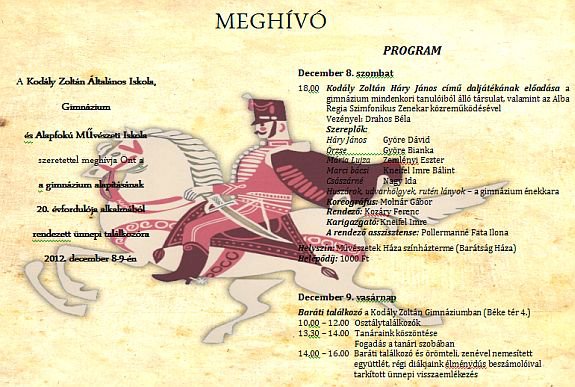 A Kodály Zoltán Gimnázium december 8-9-én ünnepli alapításának 20. évfordulóját, amelyre minden volt tanárát és diákját szeretettel várja. December 8-án este hat órakor Kodály Zoltán Háry János című daljátékának bemutatója lesz a Művészetek Házában. December 9-én pedig az iskolában lesznek a régi diákok osztálytalálkozói.