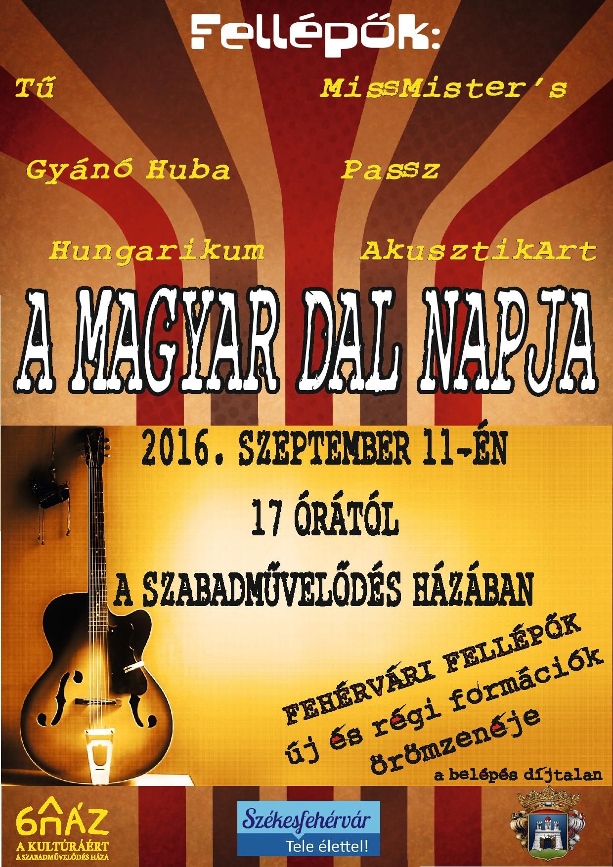 Szeptember 11-én, vasárnap 17 órától A Magyar Dal Napja alkalmából hat fehérvári formáció koncertezik A Szabadművelődés Házában. A fellépők között lesz a Tű, a MissMister's, a Gyánó Huba, a Passz, a Hungarikum és az AkusztikArt is. Sötétedés után fényfestés borítja majd A Szabadművelődés Házát Zöldnek köszönhetően.