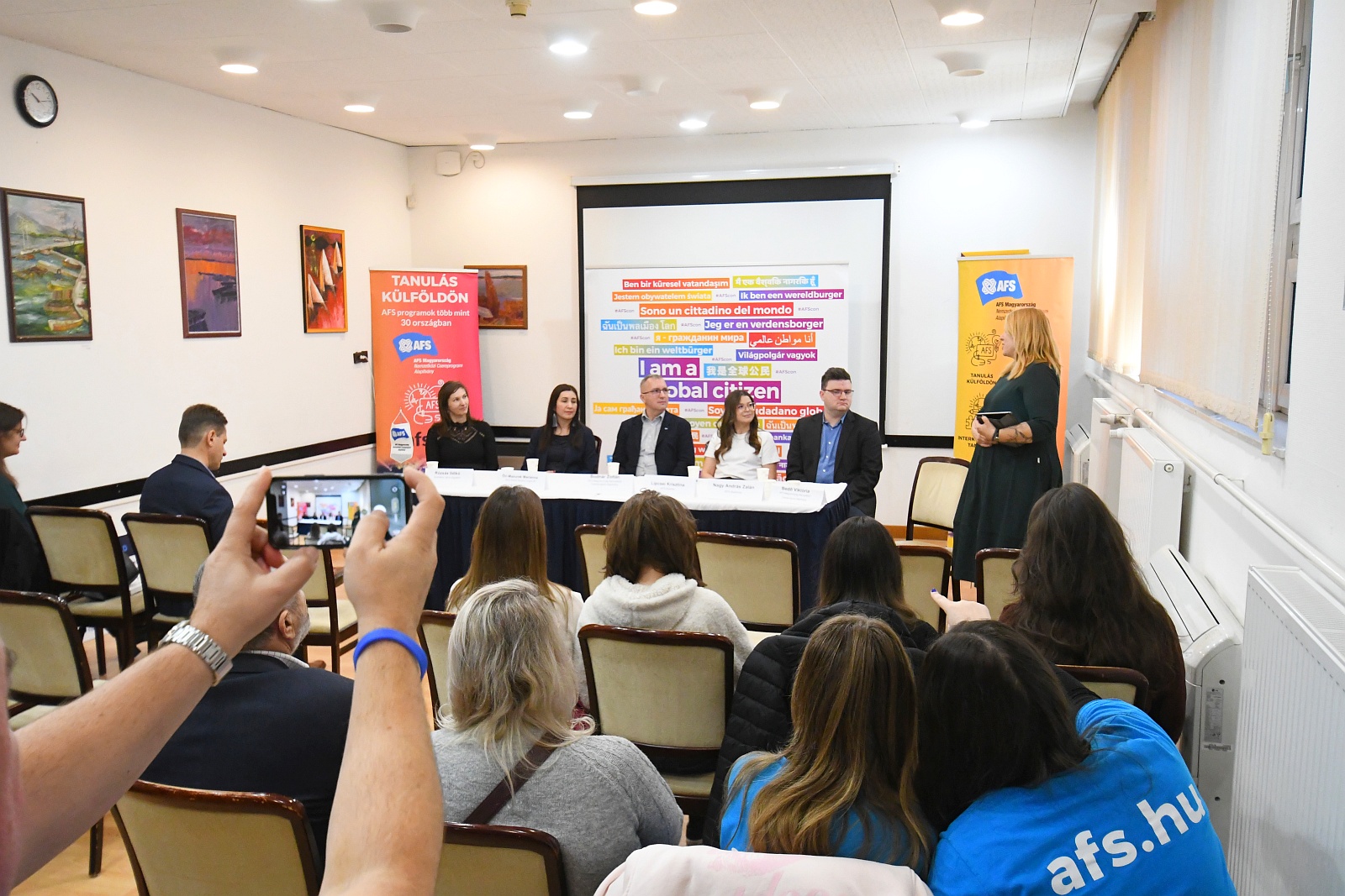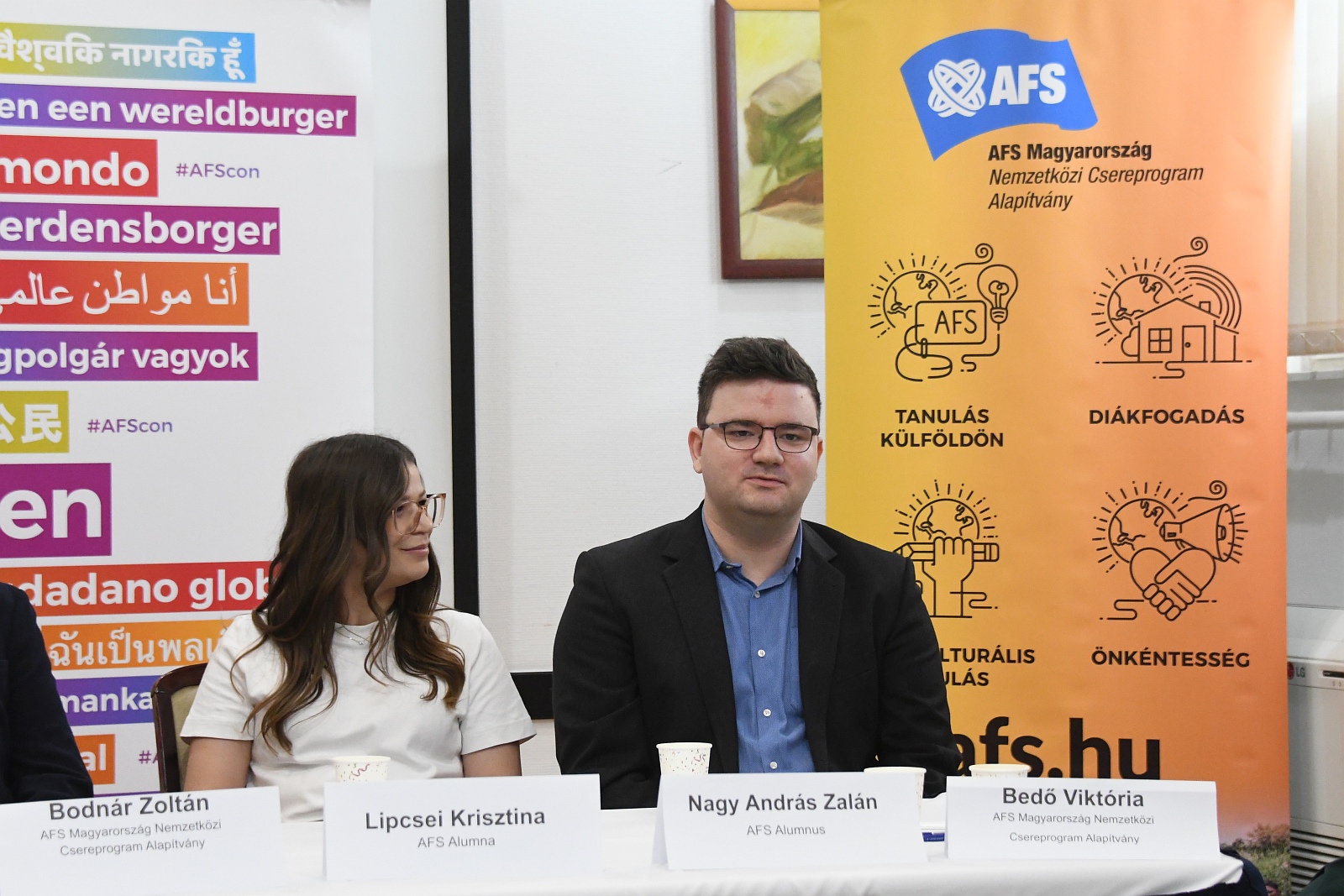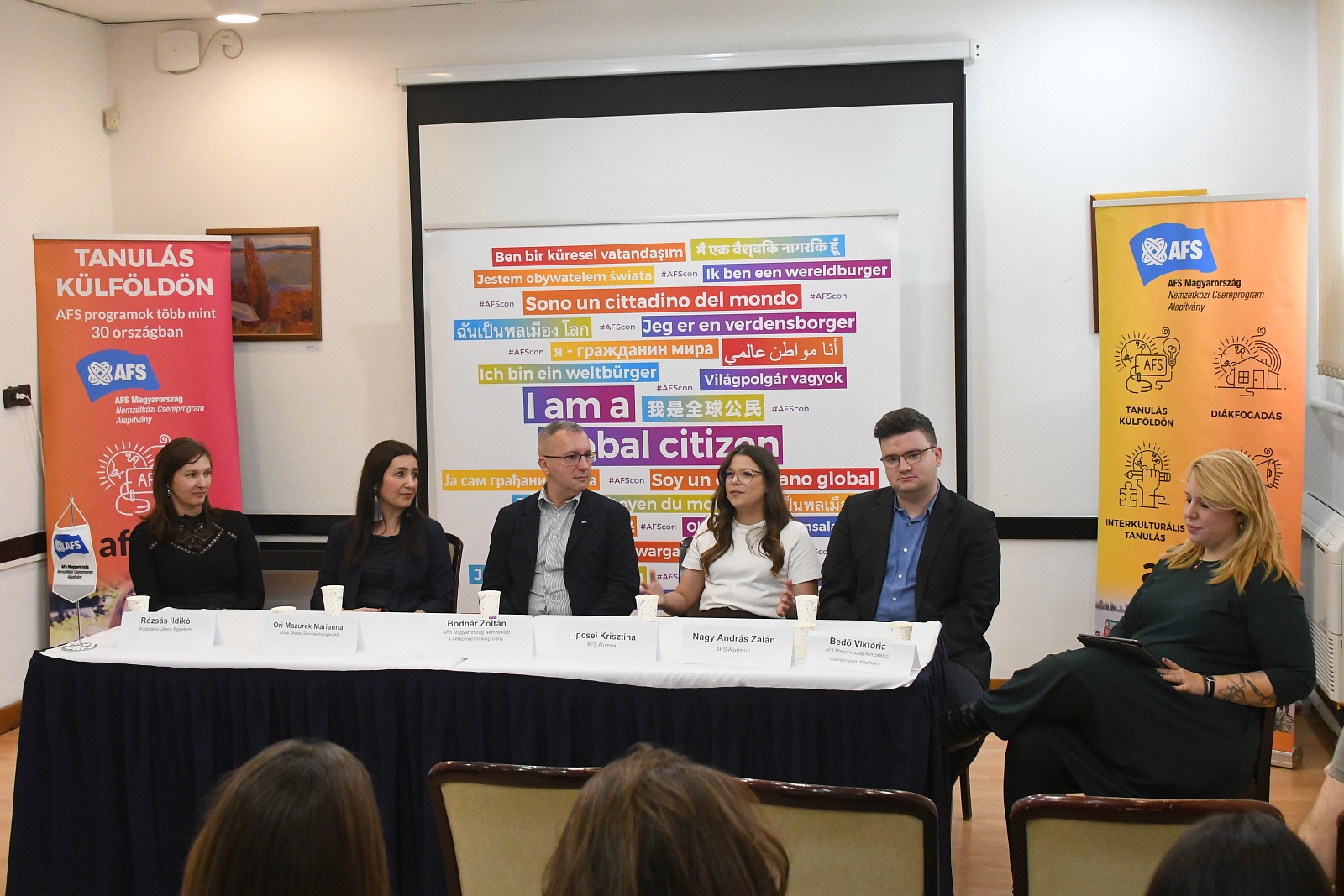 A „Határokon túl, jövőt építve - Nemzetközi élmények szerepe a középiskolások motivációjában és pályaválasztásában” című beszélgetésen az AFS Magyarország, az Alcoa, a Kodolányi János Egyetem, valamint két visszatért AFS-es cserediák vett részt.