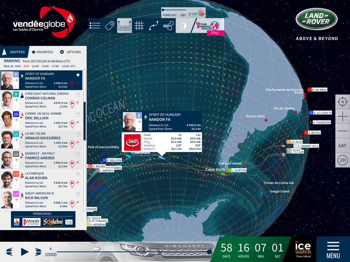 Fa Nándor a verseny 58. napján a Spirit of Hungary fedélzetén a top 10-ben hajózott a 8. helyen, a versenytáv több mint 66%-át megtéve, egyéni távolsági rekordja 432 tengeri mérföld volt, ami 800 km-t jelent. Az élen a helyzet változatlan, Alex Thomson üldözi Armel Le Cléas'h-t.