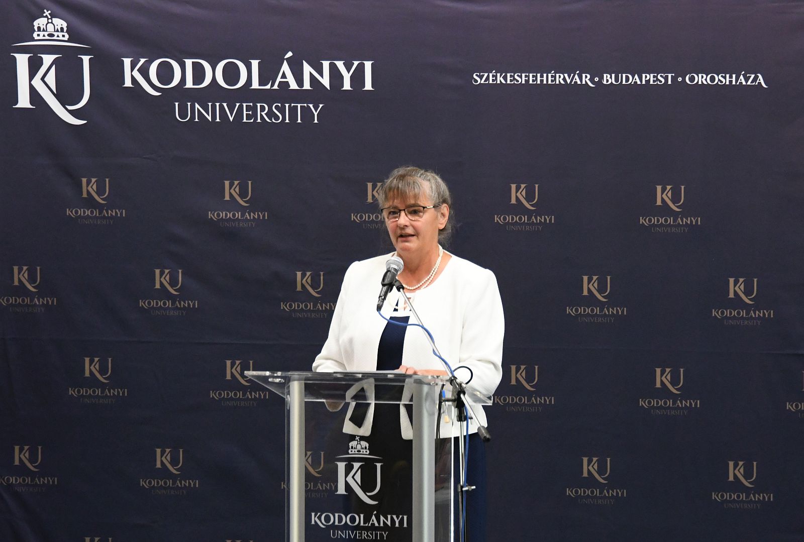 „Mindannyian a Kodolányi nagy családjába tartozunk! Az elmúlt időszakban hatalmas munkát végeztünk, hogy intézményeink fejlődjenek és hallgatóink, tanulóink számára inspiráló környezetet biztosítsunk.” – kezdte ünnepi köszöntőjét Prof. Dr. Obádovics Csilla, az Egyetem rektora. Hozzátette, büszkék arra, hogy a felvételi és a pótfelvételi eredmények igazolják az erőfeszítéseiket. A Kodolányi Egyetem népszerű a hallgatók körében, hiszen a nálunk szerzett diploma valódi értéket képvisel. A Kodolányi Gimnázium idén is rekordot ért el a jelentkezők száma, szeptembertől pedig – miniszteri döntés nyomán – a sárbogárdi Petőfi Gimnázium is a Kodolányi családhoz fog tartozni – emelte ki a rektor.