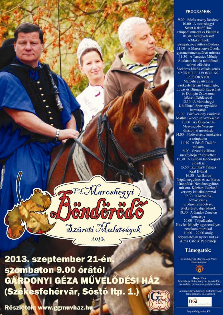 Adorján Viktor, a Gárdonyi Géza Művelődési Ház igazgatója arról szólt, hogy a város más részeiből, sőt a környező településekről is szép számmal érkeznek résztvevők a Maroshegyi Böndörödőre, miközben a városrész közösségi életének is szerves részévé vált a szüreti mulatság. „Jussunk immár ötről a hatra – ez az idei rendezvény üzenete –, és ezt csak együtt érhetjük el. Nagyon nagy eredménynek tartom, hogy a színpadi program gerincét is ez a városrész adja. A sárszentmihályi iskola Mákvirágok Színjátszó Együttesén, az Eger mellől érkező Gajdos Együttesen és Kovács Mihály muzsikuson túl minden fellépő Maroshegyhez köthető.” – ismertette a programot Adorján Viktor, aki elmondta, hogy az idei programokat a Hetedhét Játékmúzeum kitelepülése is gazdagítja, a gyerekek érdekes régi játékokkal ismerkedhetnek meg a Böndörödőn.