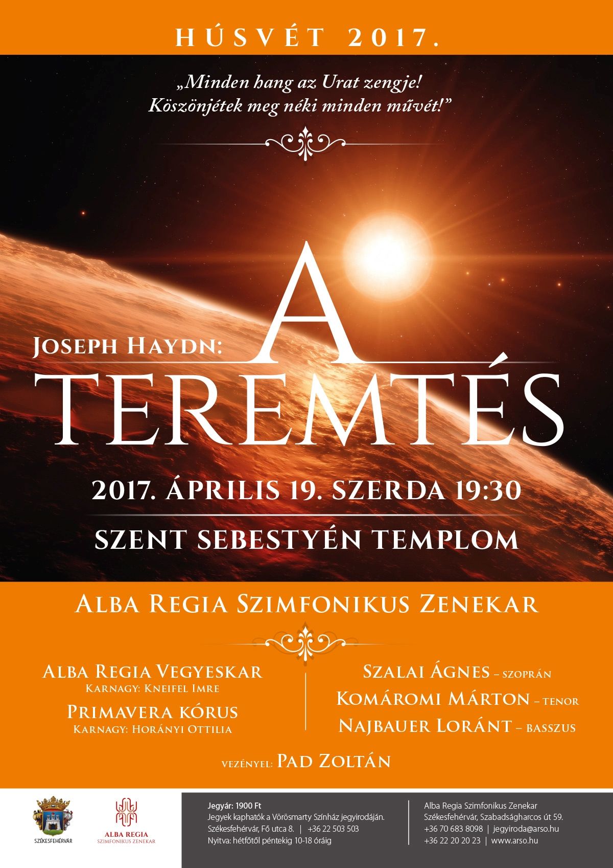 Hosszú évek hagyománya, hogy az Alba Regia Szimfonikus Zenekar hangversenyével köszönti a város a keresztény világ legnagyobb ünnepét. Idén is a Szent Sebestyén templomban lesz a húsvéti koncert, amely akusztikailag megfelelő és kellő befogadó képességgel is rendelkezik. Az esemény április 19-én, szerdán este fél 8-kor kezdődik. Joseph Haydn: A Teremtés című oratóriuma az oratóriumirodalom egyik kiemelkedő alkotása. Témája a világ teremtésének bibliai leírása. A bemutató – ami Haydn életének egyik legnagyobb sikerét hozta – Bécsben volt 1798-ban.