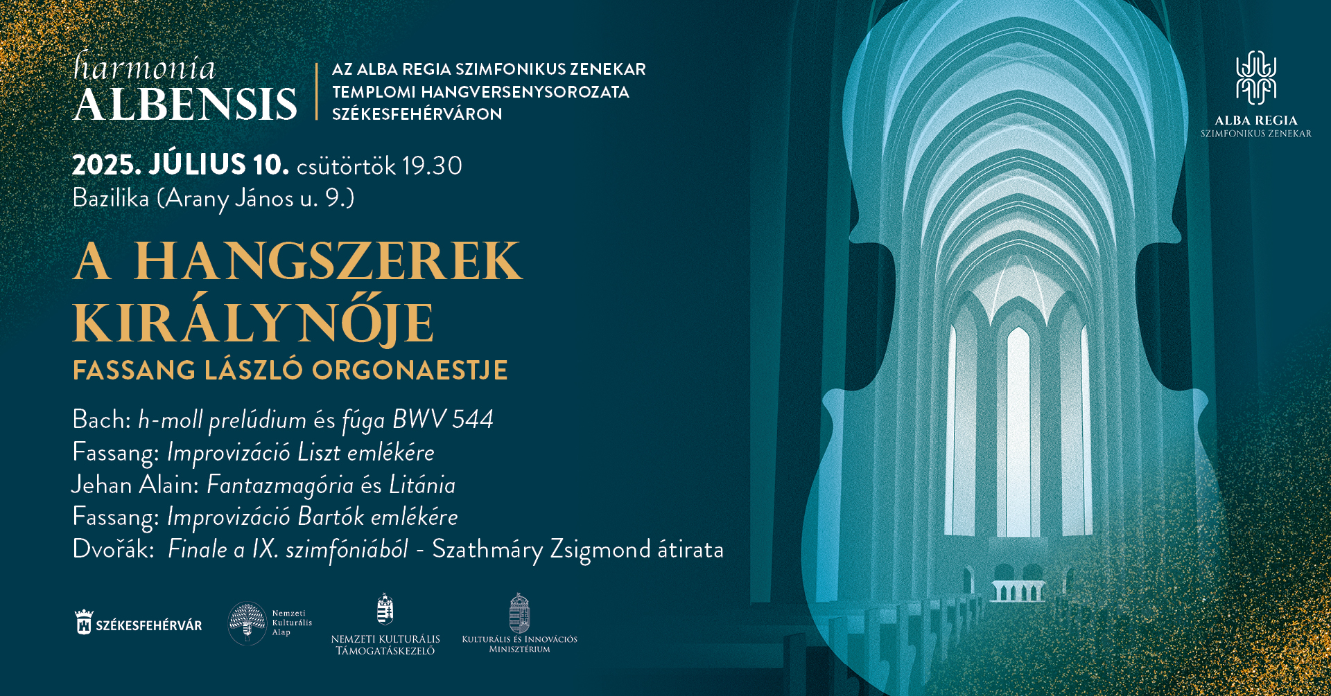 A Harmonia Albensis 2025 második estje a hangszerek királynőjét, vagyis az orgonát állítja a középpontba egy neves vendégművész fellépésével: hosszú szünet után köszönthetjük ismét Székesfehérváron Fassang László Prima- és Liszt-díjas, Érdemes művészt az ezúttal a Szent István-székesegyházban megrendezett hangversenyen. A világszerte ismert orgonaművész – számos nemzetközi verseny díjnyertese – nemcsak az orgonairodalom nagy műveinek kiváló megszólaltatója, de az improvizáció, a rögtönzés művészetének is igazi mestere: fellépése a nyári zenei program egyik fénypontjának ígérkezik, s valódi csemege az orgonazene helyi rajongóinak.