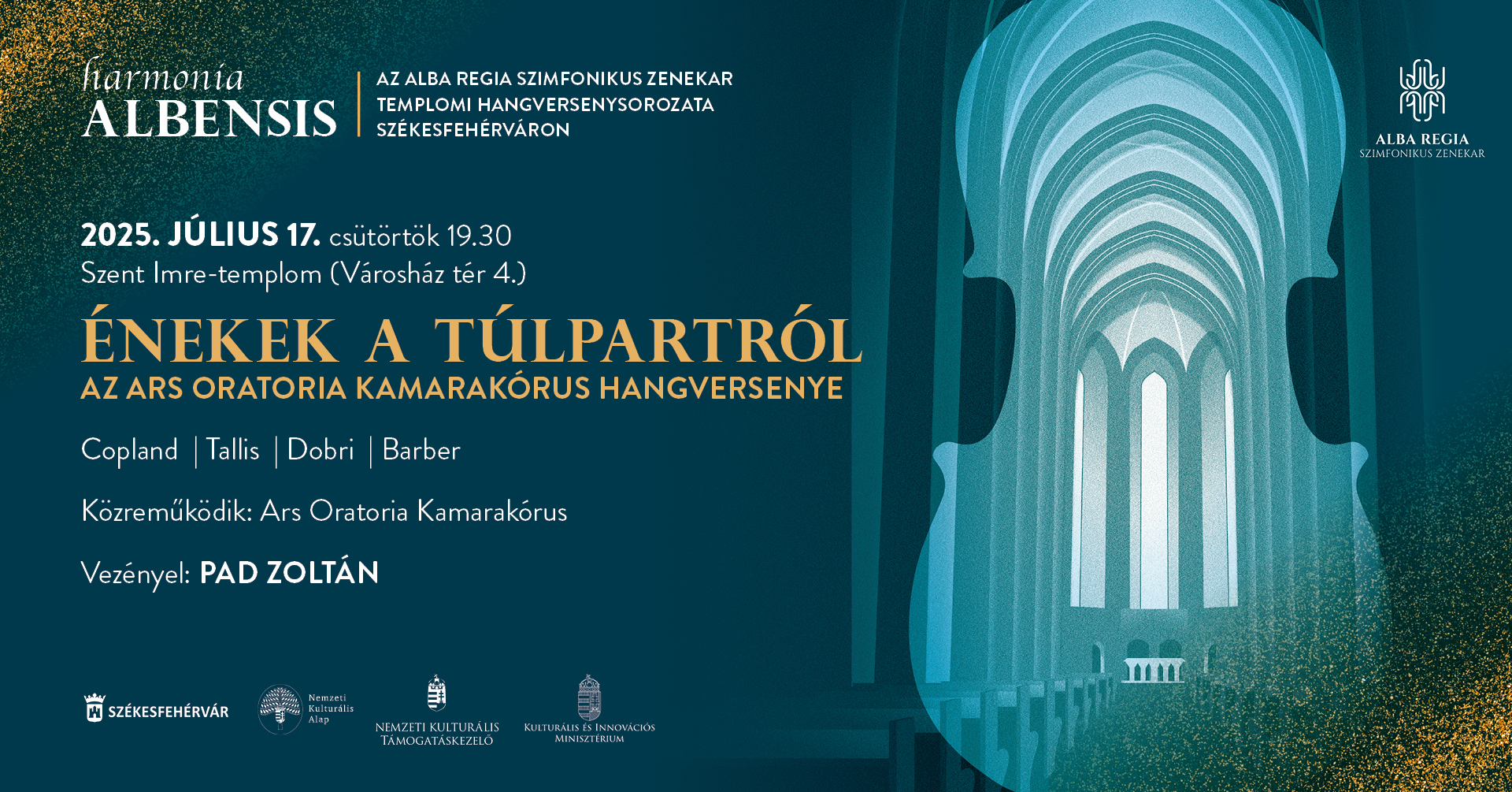 Az Alba Regia Szimfonikus Zenekar nyári hangversenysorozatának záróestje többértelmű, talán kissé talányos címet kapott: az „Énekek a túlpartól” mottó ezúttal a különleges programra utal. Egyfelől földrajzi értelemben: a műsorban legnagyobb részben tengerentúli, vagyis angol és amerikai zeneszerzők kompozíciói csendülnek fel a reneszánsztól napjainkig. Másfelől – szimbolikus értelemben – a darabok a földi életet követő transzcendens világba engednek bepillantást, az élet és a halál nagy kérdései felett töprengve. Az est egy ősbemutatóval is gazdagodik: az Alba Regia Szimfonikus Zenekar kortárs művészeti vezetője, Dobri Dániel új kórusdarabjának első előadását is meghallgathatjuk. A kóruszene kedvelői számára igazi kuriózumokat, rendkívül ritkán hallható remekműveket kínáló koncert főszereplője az Ars Oratoria Kamarakórus lesz, Pad Zoltán Liszt-díjas karnagy vezényletével.