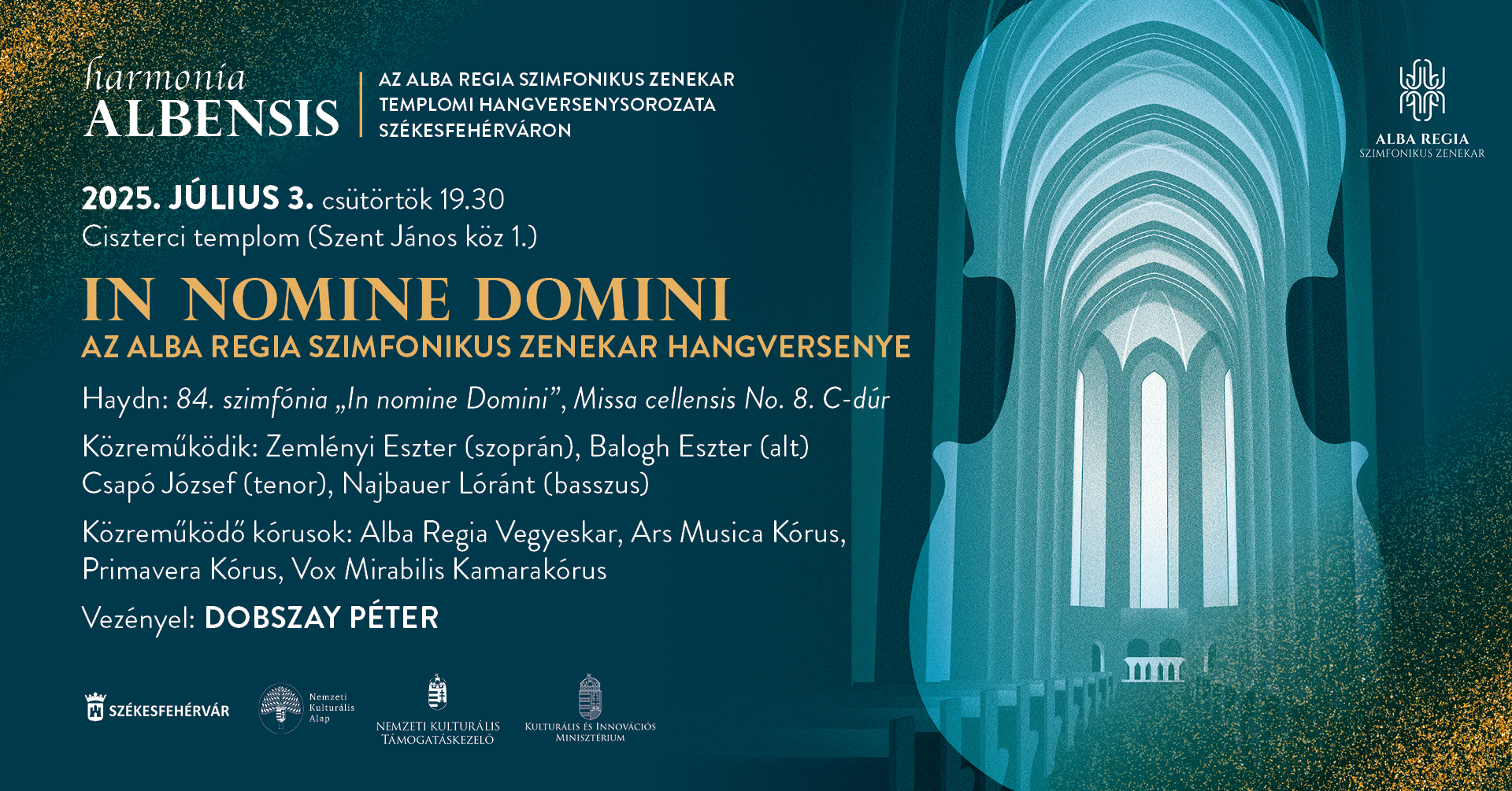 Július 03-án, csütörtökön – az elmúlt évek nagysikerű gyakorlatát folytatva – a bécsi klasszika világi és egyházi zenéjét mutatják be a székesfehérvári közönségnek, ezúttal Haydn jegyében. A Ciszterci templomban tartott nyitóesten az Alba Regia Szimfonikus Zenekar mellett Zemlényi Eszter, Balogh Eszter, Csapó József és Najbauer Lóránt énekművészek, valamint a székesfehérvári kórusok tagjaiból álló összkar működik közre, az est karmestere Dobszay Péter Junior Prima-díjas karmester lesz