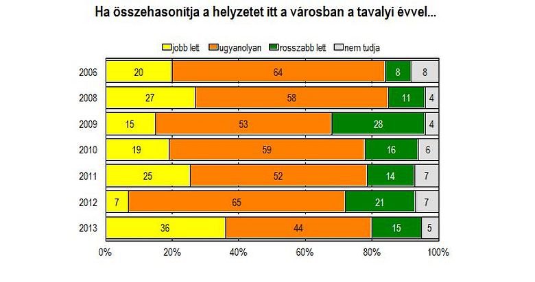 Ha összehasonítjuk a helyzetet az előző évekkel a lakosok kevesebb, mint fele 44 százaléka nem lát csak érdemi változást, szerintük ugyanúgy mennek a dolgok. Ezek aránya 2006 óta most a legalacsonyabb. A megkérdezett helyi lakosok érzik és átlátják a város elmúlt egy megvalósított fejlesztéseit, s ez lecsapódik a véleményekben is. Azok, akik szerint idén jobban mennek a város ügyei, mint egy évvel korábban, a minta egyharmadát teszik ki, míg az ellenkező póluson 15 százalékuk található.
