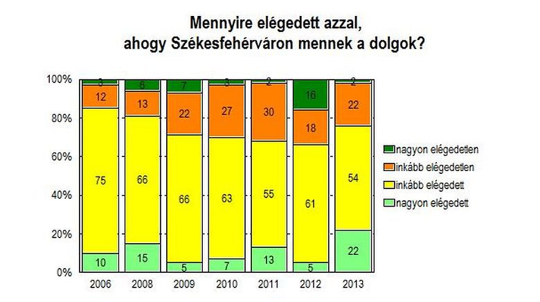 Az általános elégedettséget nézve, a gazdasági válság előtti helyi demokrácia audit adatfelvétele nagyfokú elégedettséget mért, akkor válaszolók 10 százaléka nagyon, további 75 százaléka inkább elégedett volt akkor, kritikus véleményt 15 százalék fogalmazott meg azzal kapcsolatban, hogy milyen a fehérvári helyzet. 2009-ben ezzel szemben már csak a fehérváriak 5 százaléka volt nagyon, 66 százaléka pedig inkább elégedett azzal, ahogy a városban mennek a dolgok, s 29 százalékuk volt inkább elégedetlen. Ezek mögött alapvetően a gazdasági válság negatív hatását kellett akkor látni. 2013-ban - vélhetően az érzékelhető pozitív változásoknak, beruházásoknak köszönhetően – a nagyon elégedettek aránya közé sorolható a város lakóinak több mint negyede, de további 54 százaléka is inkább elégedett, s ez összességében 2007 óta az eddigi legmagasabb elégedettséget mutatja.