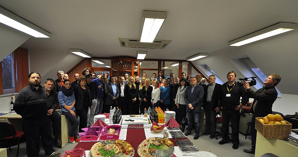 Csoportkép a szerkesztőségben a hétfői születésnapi ünnepség előtt.