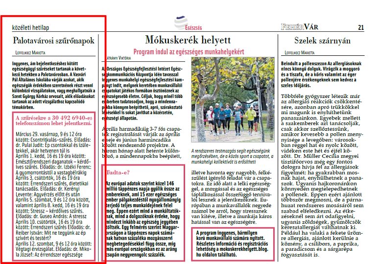 Ezúton értesítjük a kedves érdeklődőket, hogy a Fehérvár hetilap március 26-i, számban a 21. oldalon megjelent ingyenes egészségügyi szűrések időpontjai tévesen jelentek meg. A Vasvári Pál Általános Iskolában NEM tartanak március 29-én, vasárnap és az előzetesen meghirdetett áprilisi időpontokban szűrővizsgálatokat. A hibáért szíves elnézésüket, kérjük!