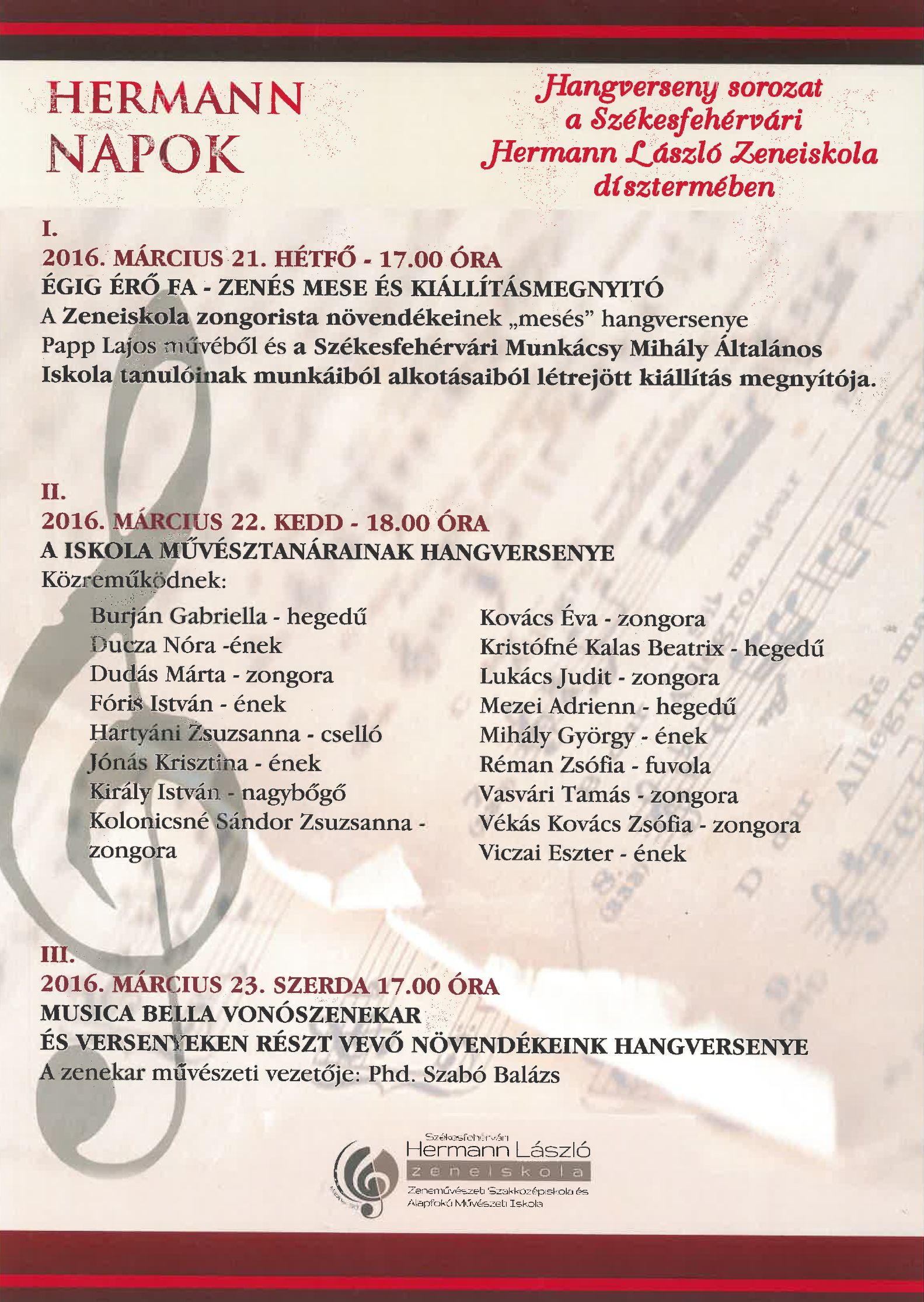 A „Hermann Napok” című sorozat március 21-én, hétfőn 17.00 órakor kezdődik az „Égig érő fa” című programmal, melynek során mesés koncertet adnak a zeneiskola zongorista növendékei. Az esemény keretében nyitják meg a Székesfehérvári Munkácsy Mihály Általános Iskola tanulóinak kiállítását. Március 22-én, kedden 18.00 órakor a zeneiskola művésztanárai adnak nagyszabású koncertet, melynek során csaknem húsz pedagógus működik közre. Március 23-án, szerdán 17.00 órakor a Musica Bella vonószenekar és a versenyeken résztvevő növendékek hangversenyével ér véget a programsorozat.
