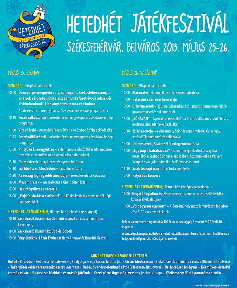 A Hetedhét Játékfesztivál programjait F. Szegő Krisztina, a Székesfehérvári Turisztikai Kft. ügyvezetője és Bernáth Éva, a Hetedhét Játékmúzeum múzeumpedagógusa ismertette. Elmondták: a játékfesztivál vendége lesz többek között Palya Bea és a Vaskakas Bábszínház. Ez a teátrum az ország legnagyobb gyermekfesztivál-főszervezője, amely a nagyobbaknak szóló előadás mellett csecsemőszínházi programmal is készül.