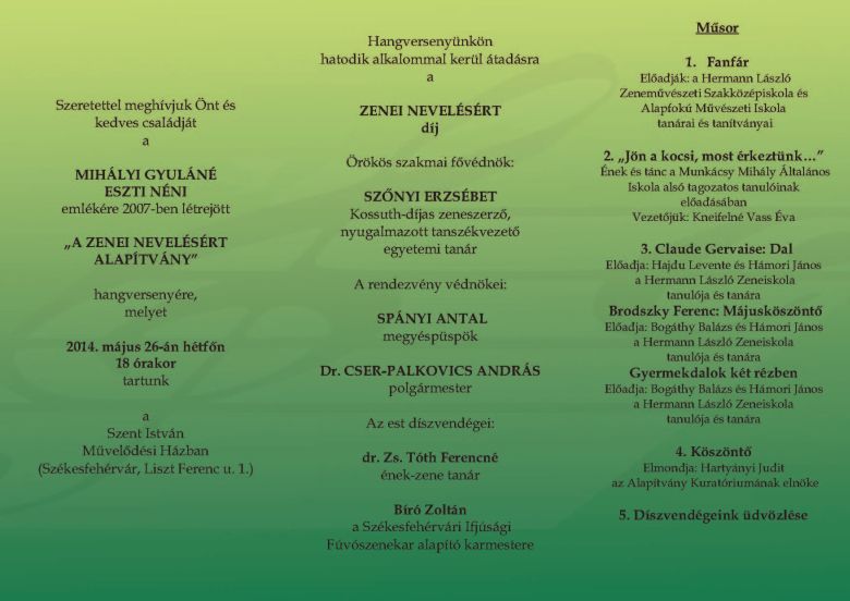 Hatodik alkalommal adják át ünnepélyes keretek között a „Zenei Nevelésért” díjat május 26-án, hétfőn a Szent István Művelődési Házban. A Zenei Nevelésért Alapítványt 2007-ben Mihályi Gyuláné Eszti néni emlékére alapították meg gyermekei. Eszti néni egész életében Székesfehérvár zenei életének az egyik mozgatója, szervezője és aktív résztvevője volt.