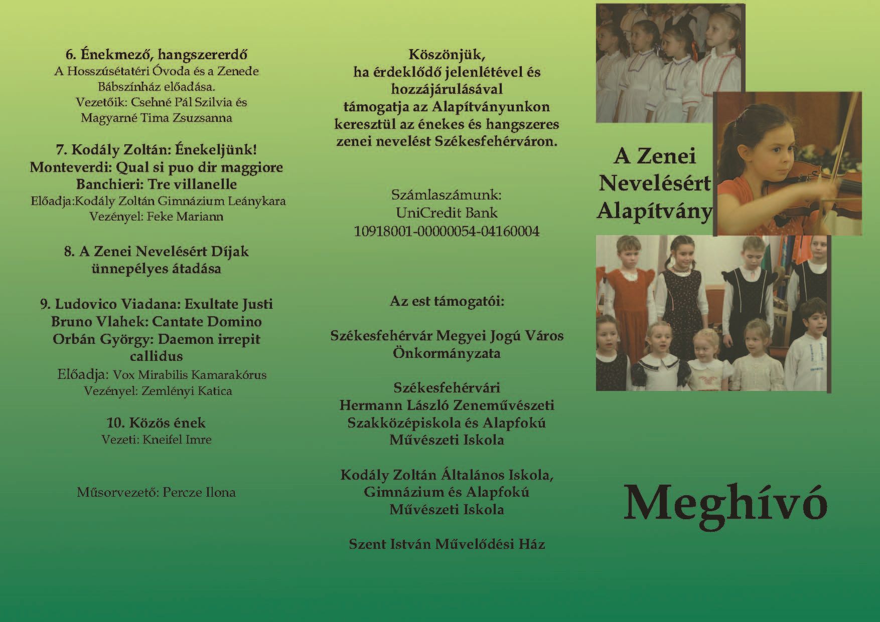 A május 26-án, hétfőn 18.00 órakor kezdődő hangversenyen a megjelenteket Hartyányi Judit, az Alapítvány kuratóriumi elnöke köszönti, majd a Munkácsy Mihály Általános Iskola, a Hermann László Zeneiskola, a Hosszúsétatéri Óvoda és a Zenede Bábszínház, a Kodály Zoltán Gimnázium Leánykara, valamint a Vox Mirabilis Kamarakórus lép színpadra. A „Zenei Nevelésért” Díjak átadását követően közös énekléssel zárul az ünnepi este a Szent István Művelődési Házban.