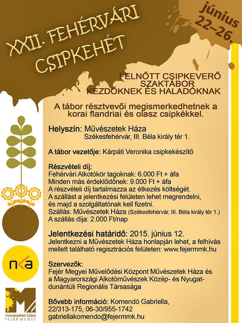 2015. június 22-26-a között tartják meg a XXII. Fehérvári Csipkehetet. A kezdőknek és haladóknak egyaránt szóló felnőtt csipkeverő szaktáborban a résztvevők megismerkedhetek a korai flandriai és olasz csipkék elkészítésének módjaival is. A Művészetek Házában szervezett eseményre sok szeretettel várnak minden érdeklődőt a szervezők.