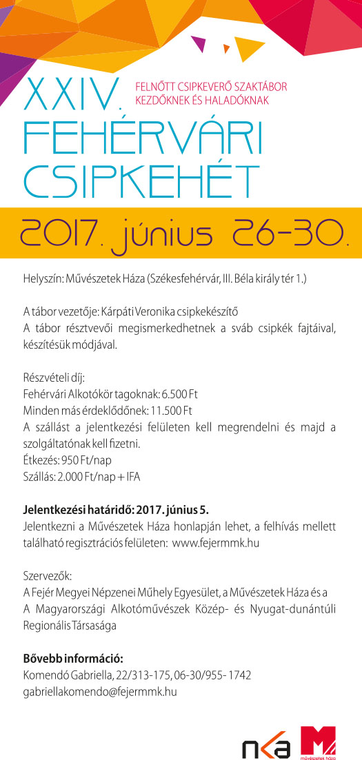 Június 26-a és június 30-a között tartják meg a XXIV. Fehérvári Csipkehetet. A kezdőknek és haladóknak egyaránt szóló felnőtt csipkeverő szaktáborban a résztvevők megismerkedhetek a sváb csipkék elkészítésének módjaival is. A Művészetek Házában szervezett eseményre sok szeretettel várnak minden érdeklődőt a szervezők.
