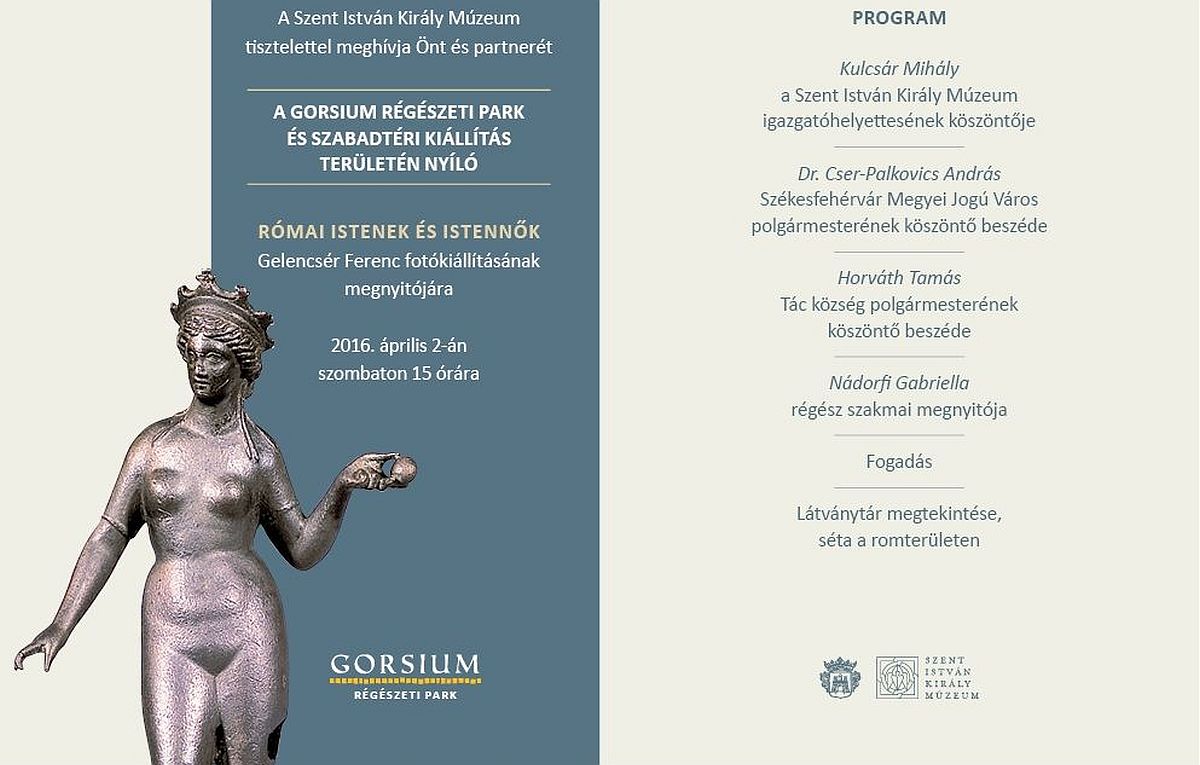Gorsium – a tavaly év végén lezárult felújítást követően – megnyitja kapuit az ókor iránt érdeklődők előtt. Az új köntösbe öltözött régészeti park első rendezvénye április 2-án, szombaton délután lesz. Gelencsér Ferenc fotóművész „Római istenek és istennők” tárlatára a szervezők mindenkit szeretettel várnak!