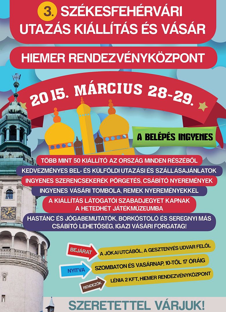 Az eseményen ingyenes vásári tombolával, remek nyereményekkel - köztük kül- és belföldi utakkal - a hétvégére időzített utazási kedvezményekkel, vasúttörténeti kiállítással, borkóstolóval és Hetedhét Játékmúzeumba szóló térítésmentes családi belépővel csábítják az érdeklődőket. A részleteket sajtótájékoztatón ismertette Posch Ede, a Lénia 2 Kft. ügyvezetője és Turi Krisztina, a Hiemer Rendezvényközpont rendezvényszervezője. „Egyre növekvő érdeklődés mellett rendezzük meg a hétvégén a 3. Székesfehérvári Utazás Kiállítás és Vásárt. Két évvel ezelőtt 19, tavaly 29 kiállítónk volt, idén azonban közel 60 kiállító mutatja be ajánlatait, minden talpalatnyi hely elkelt.” – emelte ki Posch Ede főszervező, ötletgazda, a Lénia 2 Kft. ügyvezetője.