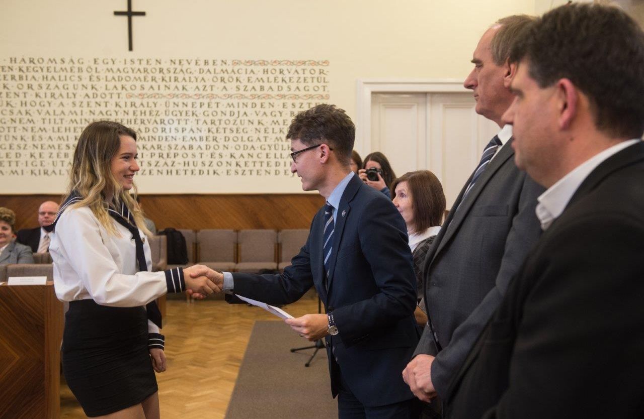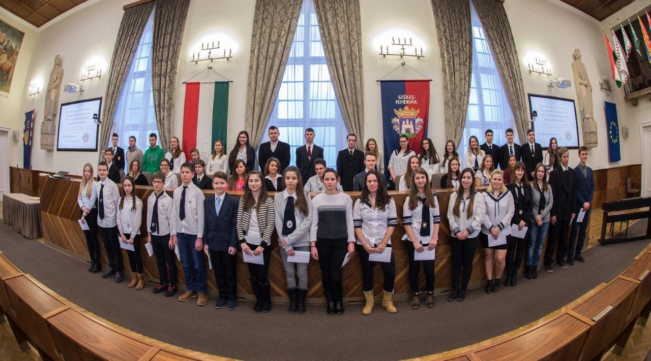 A Székesfehérvári Szakképzési Centrum Jáky József Szakgimnáziuma és Hunyadi Mátyás Szakgimnáziuma diákjainak műsora után az ösztöndíjak ünnepélyes átadása következett. Az idei évben kilencvenkét pályázat érkezett, amelyből hetven nyert támogatást. Tizenhárom általános iskolást, harminchét középiskolást és húsz felsőfokú oktatásban tanulót tudtak támogatni ebben az évben. A Városháza Dísztermében tartott ünnepség zárásaként a sikeresen pályázó hetven diák Cser-Palkovics András polgármestertől vehette át az ösztöndíjról szóló dokumentumot.