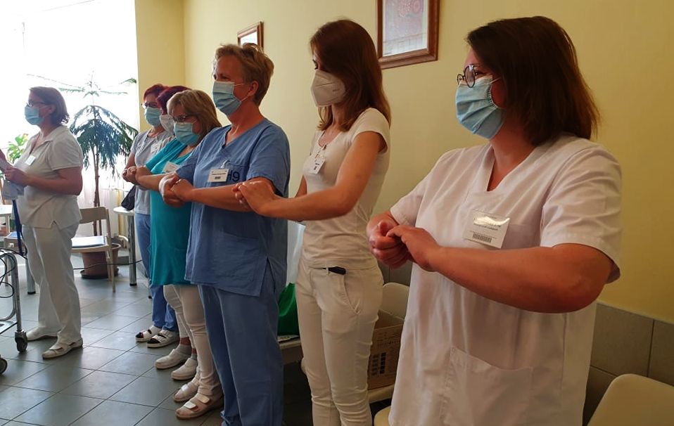 Dr. Pásztor László a helyes módszert is ismertette: kellő mennyiségű fertőtlenítőszert kell adagolni, utána a két tenyeret jó erősen összesikáljuk, majd a kézhát következik, és fontos az is, hogy az ujjainkat ujjtőtől ujjbegyig mindenütt érje a fertőtlenítőszer. Ezt követően meg kell dörzsölni a kezet összekulcsolva, azután a hüvelykujjat, az ujjbegyeket, végül pedig a csuklót. "Ezt a mozdulatsort egy egészségügyi dolgozónak minden körülmények között reflexből tudnia kell!" - hívta fel a figyelmet a a Higiénés osztály főorvosa.