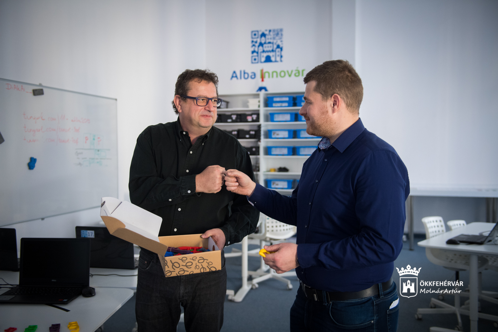 A higiénés kezdeményezésből gyártott első harminc eszközt Tisztl Henrik, az Alba Bástya Család- és Gyermekjóléti Központ vezetője vette át Laufer Tamás központvezetőtől.