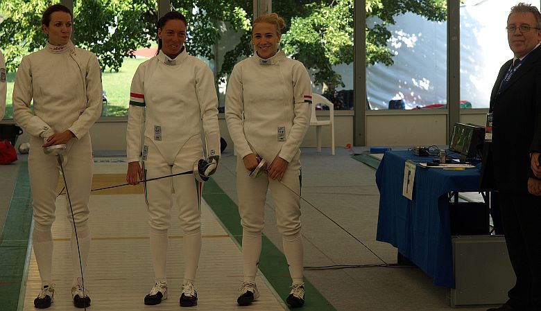 Kiválóan kezdte a vívást Kovács Sarolta, aki az első öt asszóját zsinórban megnyerte, és ezt követően is kitűnő formában maradva már 10/1-es mutatóval vezette a mezőnyt. Az első tusa második felében azonban hátrébb esett a rangsorban, de végül így is a harmadik helyen, 238 ponttal zárta a vívást holtversenyben a brit Mhairi Spence-szel. Alekszejev Tamarának sajnos nem igazán sikerült jól az első szám, mivel 14/21-es mutatóval, és 184 ponttal a huszonhatodik helyen végzett.