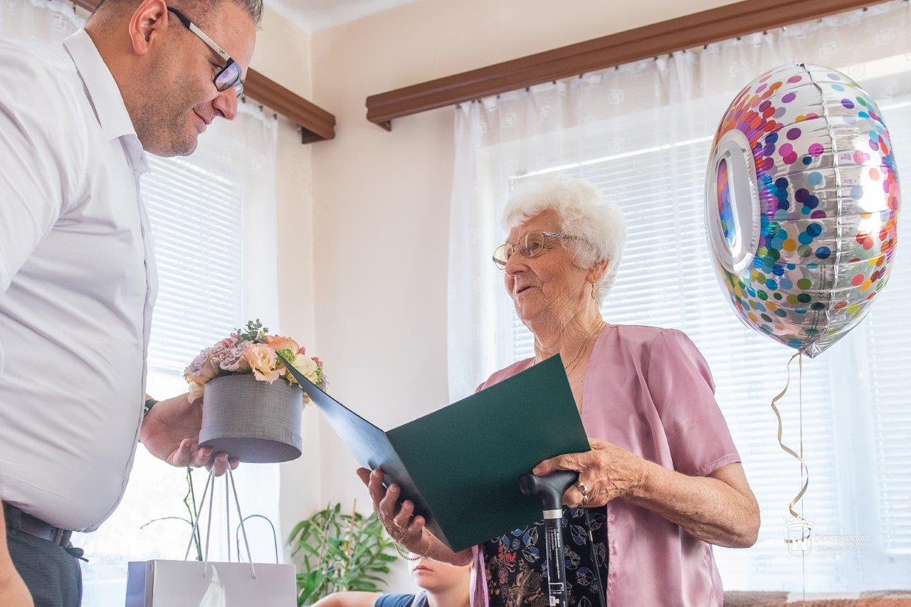 A születésnapost Börgöndi úti otthonában köszöntötte Mészáros Attila alpolgármester, a városrész önkormányzati képviselője, aki átnyújtotta az ünnepeltnek a miniszterelnök gratuláló sorait tartalmazó levelet és a város ajándékát.