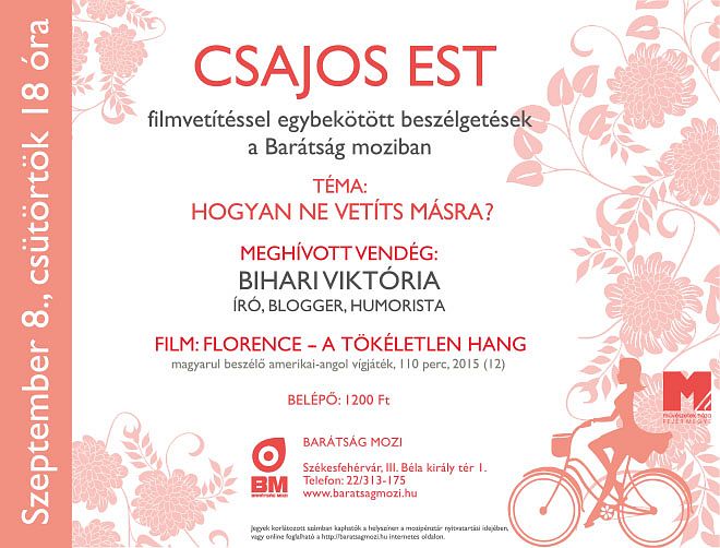 Az évadnyitó Csajos est vendége Bihari Viktória író, blogger, humorista lesz szeptember 8-án, 18 órától a Barátság Moziban. A beszélgetésben szó lesz arról, miként legyünk önmagunk és hogyan ne éljük azt az életet, melyet a szüleink szántak nekünk. Szóba kerül majd a másikra való vetítés, az elvárások, a hibák keresése és saját képünkre formálás.