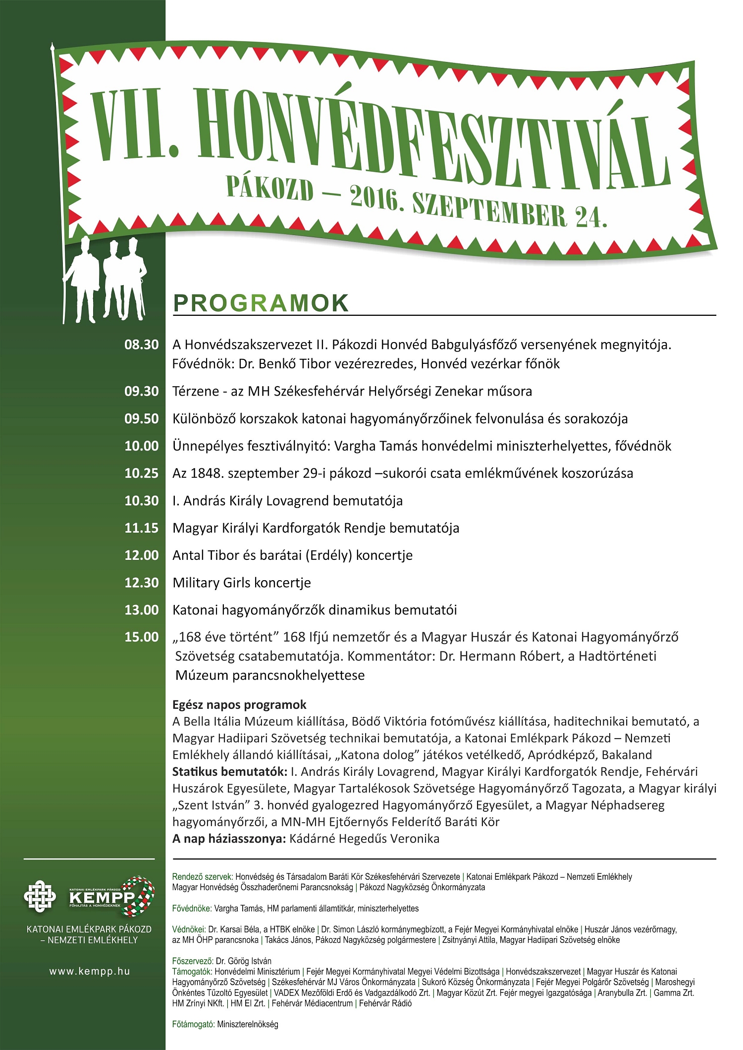Az ünnepélyes fesztiválnyitó 10 órakor kezdődik, melyen Vargha Tamás honvédelmi miniszterhelyettes, a rendezvény fővédnöke mond köszöntőt, majd megkoszorúzzák a pákozd-sukorói csata emlékművét. A Magyar Honvédség Székesfehérvár Helyőrségi Zenekar térzenés műsorral fogja szórakoztatni a parkba látogatókat, míg a különböző korok katonai hagyományőrző egyesületei látványos bemutatókkal készülnek. Így láthatunk majd kardforgatást, felvonulást és sorakozást is tőlük. A gyerekeket „Katona dolog” játékos vetélkedőre várják, de lesz Apródképző és Bakaland is.