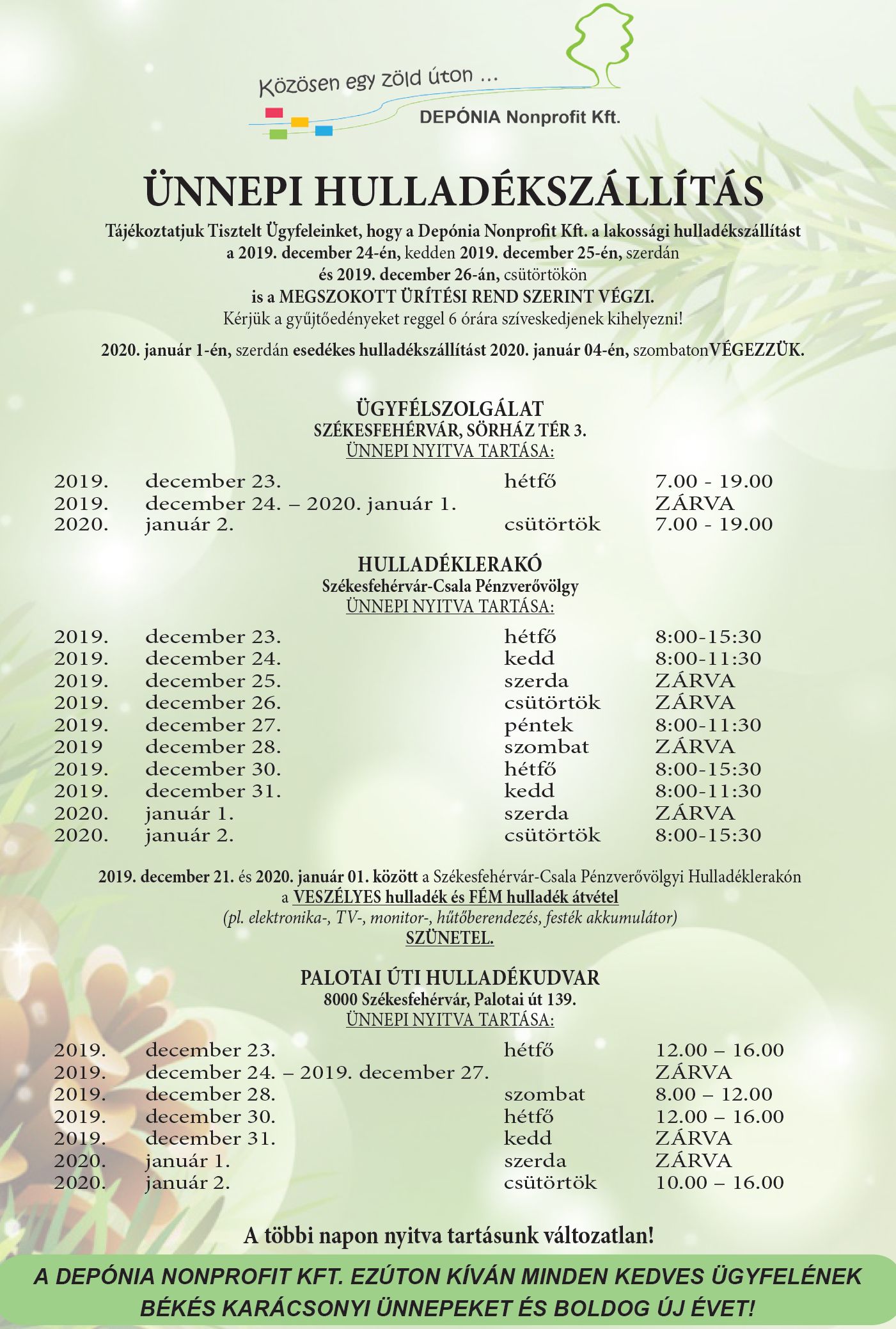 A Depónia tájékoztatja a fehérvári ügyfeleket, hogy december 24-én, 25-én és 26-án is a megszokott rendben történik a szemétszállítás. A szolgáltató kérése, hogy a kukákat reggel hat órára szíveskedjenek kihelyezni a házak elé. A december 14-i áthelyezett munkanapon, szombaton nem lesz hulladékszállítás, a 2020 január elsejei szemétszállítást pedig január 4-én szombaton végzik majd.