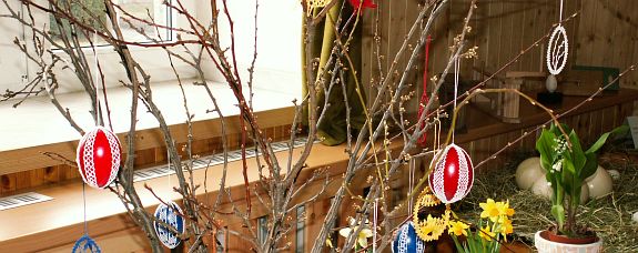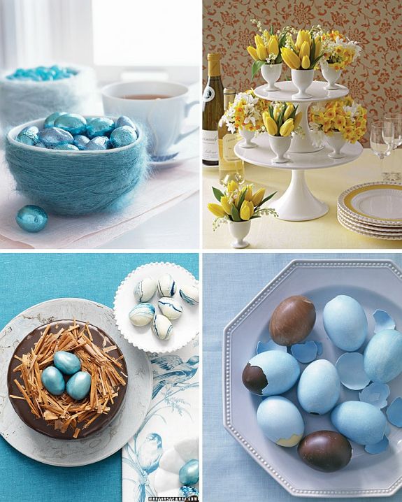 A dekoráció főként a harmonikus, pasztell árnyalatú terítőkből, drapériákból állhat. A barkaágakra kifújt és festett tojásokat akasztanak, és kis fonott kosárkákban festett tojásokat fektetnek száraz fűre, vagy zöld színű krepp papírra. A csokoládétojások legfeljebb a konyhába valók, dekorációs célra alkalmatlanok.