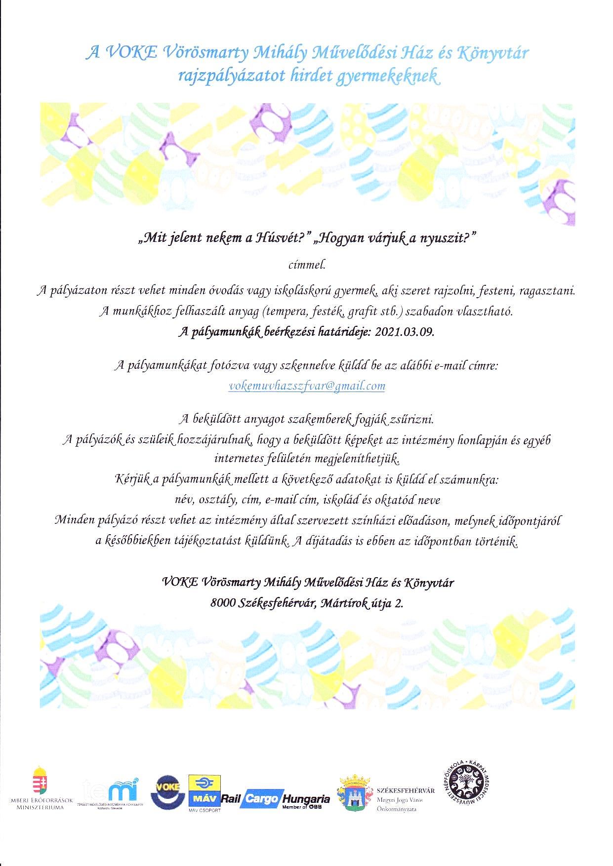Rajzpályázatot hirdet gyermekeknek a VOKE Vörösmarty Mihály Művelődési Ház és Könyvtár „Mit jelent nekem a húsvét? Hogyan várjuk a nyuszit?” címmel. Az óvodások és általános iskolások alkotásait március 9-ig várják.