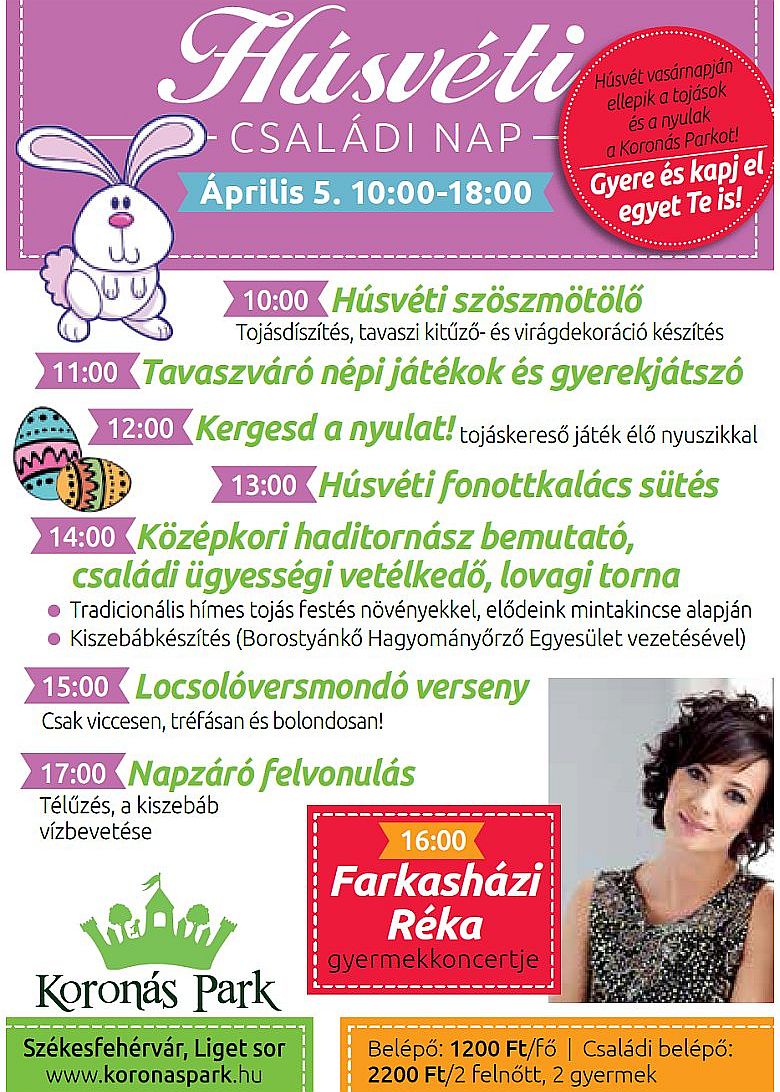 Több érdekes programot is szerveznek húsvét alkalmából április 5-én, vasárnap a Koronás Parkban. A Húsvéti családi nap keretében többek között tavaszváró népi játékokkal, tojásdíszítéssel, haditornász bemutatóval, fonott-kalács sütéssel, valamint Farkasházy Réka gyermekkoncertjével várnak mindenkit a szervezők. A programok délelőtt 10-től délután 18 óráig tartanak.