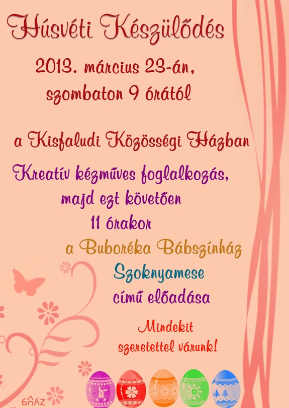 Március 23-án szombaton 9 órától kreatív kézműves foglalkozást tartanak az érdeklődőknek a Kisfaludi Közösségi Házban. Ezt követően 11 órától a Buboréka Bábszínház előadása várja a gyerekeket Szoknyamese című előadásával. A két lány és a vasorrú banya című magyar népmese nyomán készült bábjátékot Szívós Károly rendezte. A húsvéti készülődés jegyében megrendezett családi programokra szeretettel várnak mindenkit a szervezők.