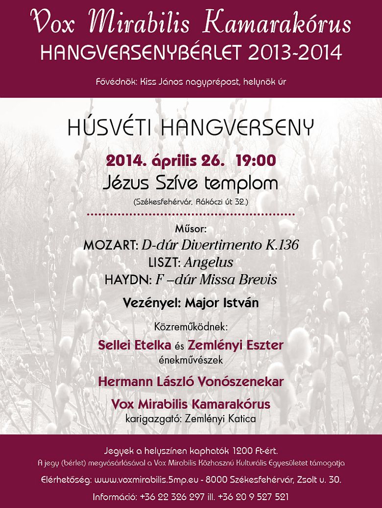 2014. április 26-án, szombaton a Jézus Szíve templomban szervez Húsvéti Koncertet a Vox Mirabilis Kamarakórus. Az eseményen a Hermann László Vonószenekar, Sellei Etelka és Zemlényi Eszter énekművészek is fellépnek. A Húsvéti Koncert este 19 órakor kezdődik, melyre minden érdeklődőt sok szeretettel várnak. Jegyek a helyszínen kaphatók! További információ a www.voxmirabilis.5mp.eu oldalon található.