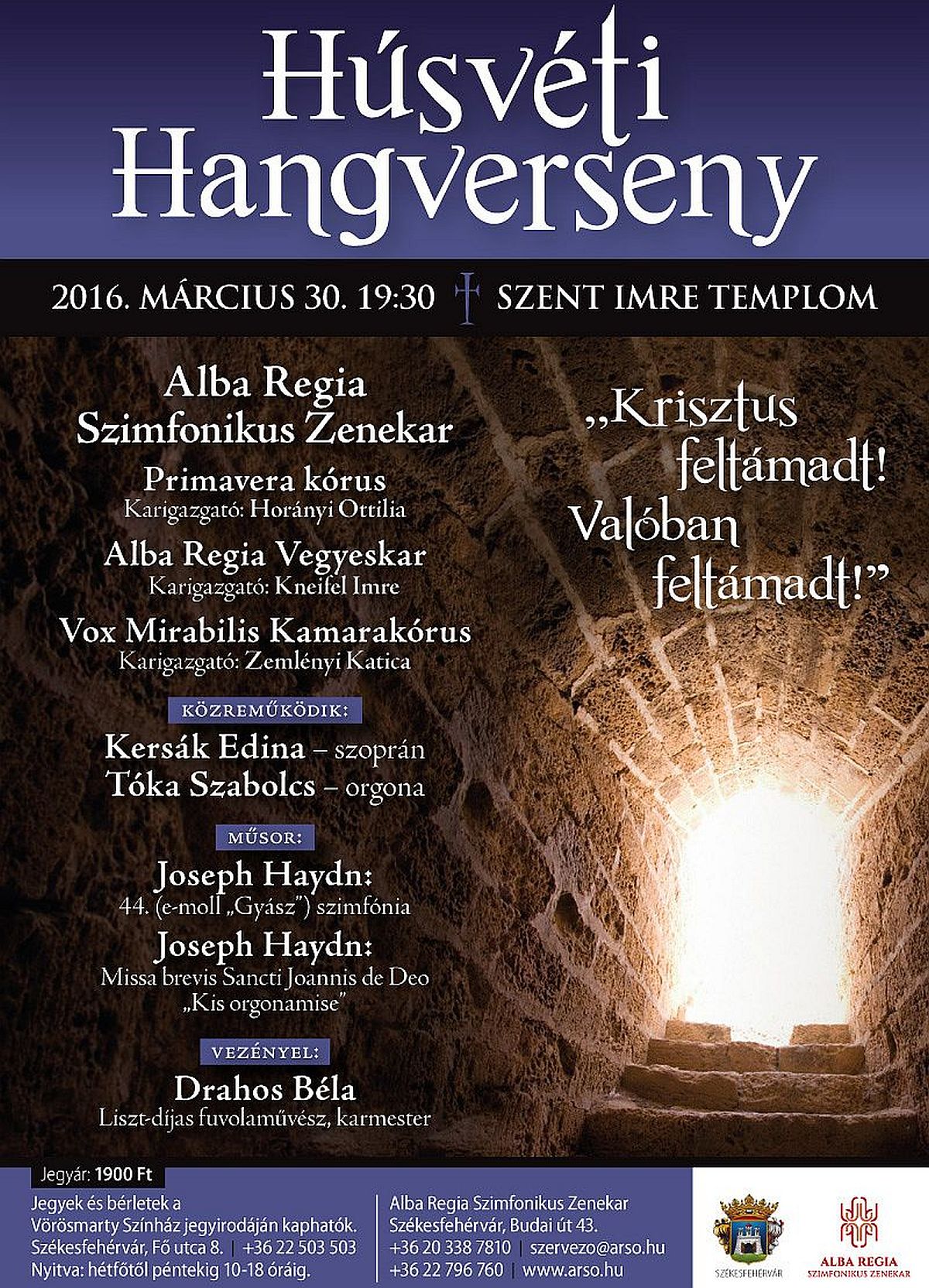 Újabb komolyzenei csemegével örvendezteti meg a közönséget az Alba Regia Szimfonikus Zenekar. A "Krisztus feltámadt! Valóban feltámadt!" című húsvéti koncert 2016. március 30-án, szerdán 19.30 órakor kezdődik a Szent Imre templomban. A programon közreműködik az Alba Regia Vegyeskar, a Primavera Kórus és a Vox Mirabilis Kamarakórus, szólót énekel Kersák Edina szoprán, orgonán pedig Tóka Szabolcs működik közre. A hangversenyen Joseph Haydn 44. e-moll, "Gyász" szimfóniája, valamint Missa brevis Sancti Joannis de Deo, "Kis orgonamise" című műve csendül fel. A koncertet Drahos Béla vezényli. A szimfonikusok estjére 1.900 forintos áron lehet jegyet váltani a Vörösmarty Színház jegyirodájában, amely 10.00-18.00 óra között tart nyitva.