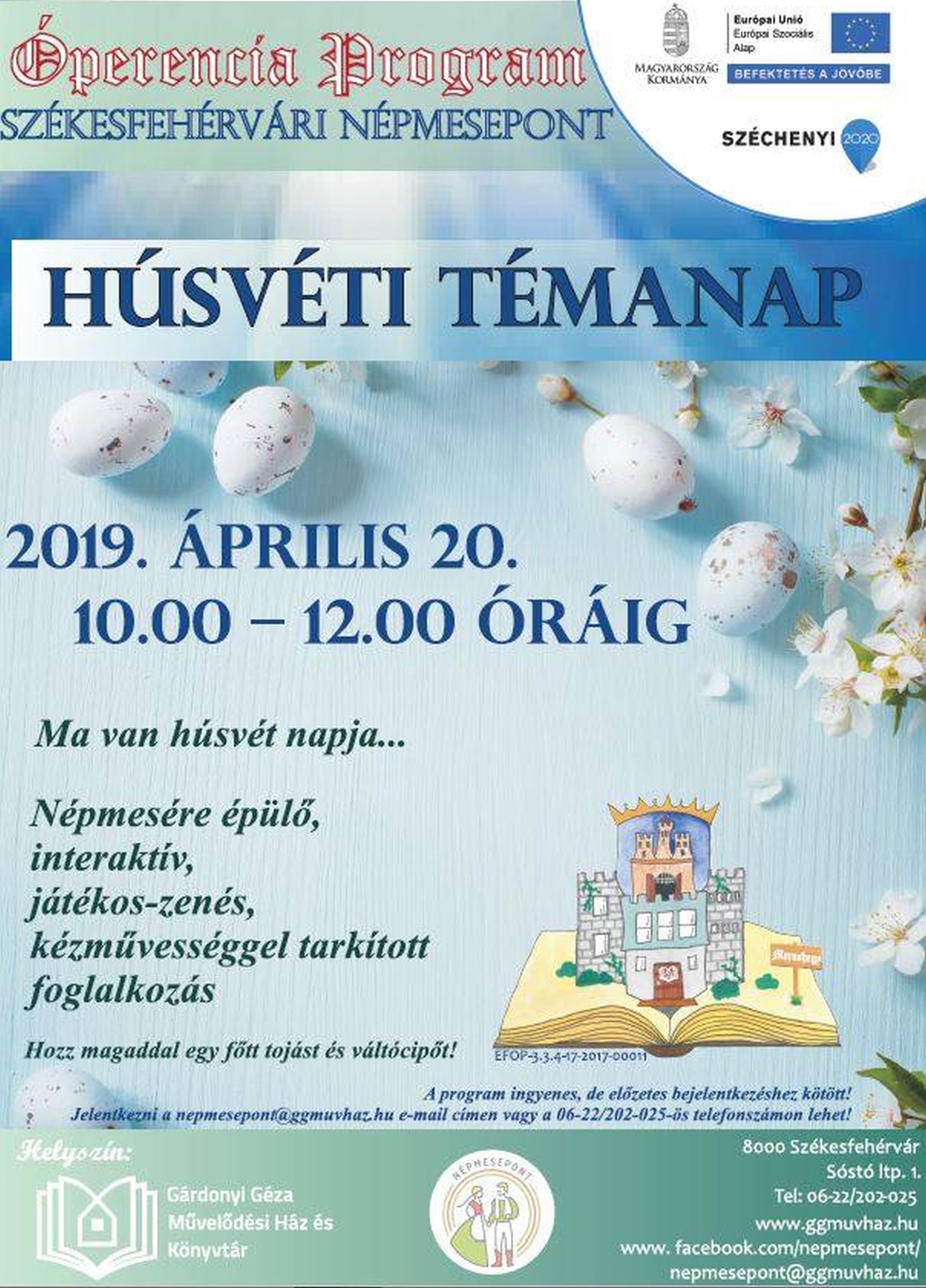 Április 20-án, szombaton 10 és 12 óra között húsvéti témanapot lesz a Székesfehérvári NépmesePonton. Várnak mindenkit, aki részt szeretne venni egy népmesére épülő, interaktív, játékos-zenés, kézművességgel tarkított foglalkozáson, a Gárdonyi Géza Művelődési Ház és Könyvtárban található NépmesePonton.