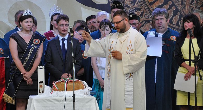 Ezt követően Cser-Palkovics András polgármester köszöntötte az öreghegyieket, majd Tornyai Gábor plébános szentelte meg az új kenyeret. Köszöntőjében Székesfehérvár polgármestere elmondta, hogy elképzelhetetlen a Királyi Napok rendezvénysorozata az Öreghegyi Mulatság nélkül, amely idén különleges eseménnyel, egy dombormű avatásával is gazdagodik. "A Bory várral szemben egy olyan ember domborművét avatjuk ma, aki sokat tett a hagyományok ápolásáért, a Bory vár megmentéséért. Dr. Ágoston Béla domborműve azt üzeni számunkra, hogy bátran vigyük tovább a régi és újabb keletű hagyományainakt is. " - emelte ki Székesfehérvár polgármestere. A köszöntőt követően Tornyai Gábor plébános Isten áldását kérte az új kenyérre és borra.