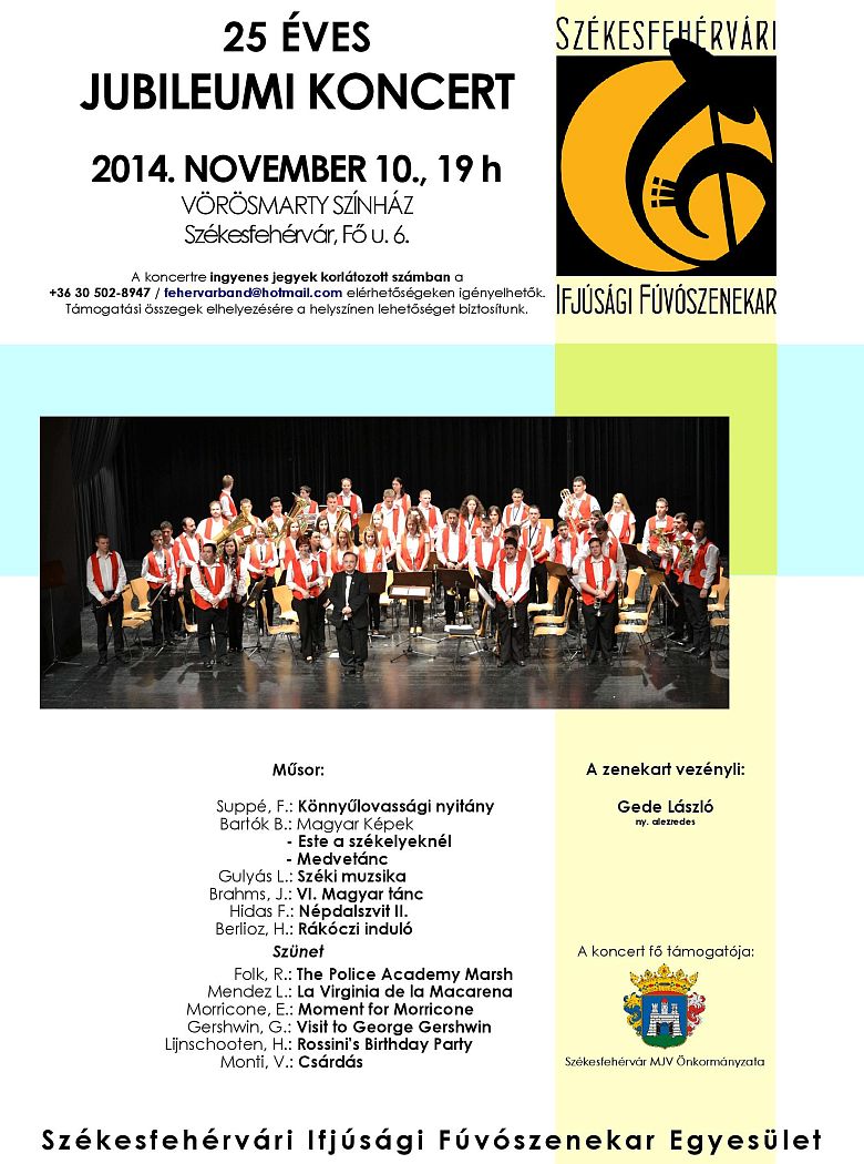 A Székesfehérvári Ifjúsági Fúvószenekar nagyszabású hangversennyel ünnepli fennállásának 25 éves jubileumát. A jeles évforduló alkalmából szervezett koncert 2014. november 10-én, hétfőn este 19 órakor kezdődik a Vörösmarty Színházban. Az eseményen ünnepi beszédet mond Brájer Éva, Székesfehérvár alpolgármestere. A zenekart Gede László, ny. alezredes vezényli. Az ünnepi rendezvényt ingyenesen lehet megtekinteni, jegyeket azonban előzetesen kell igényelni.