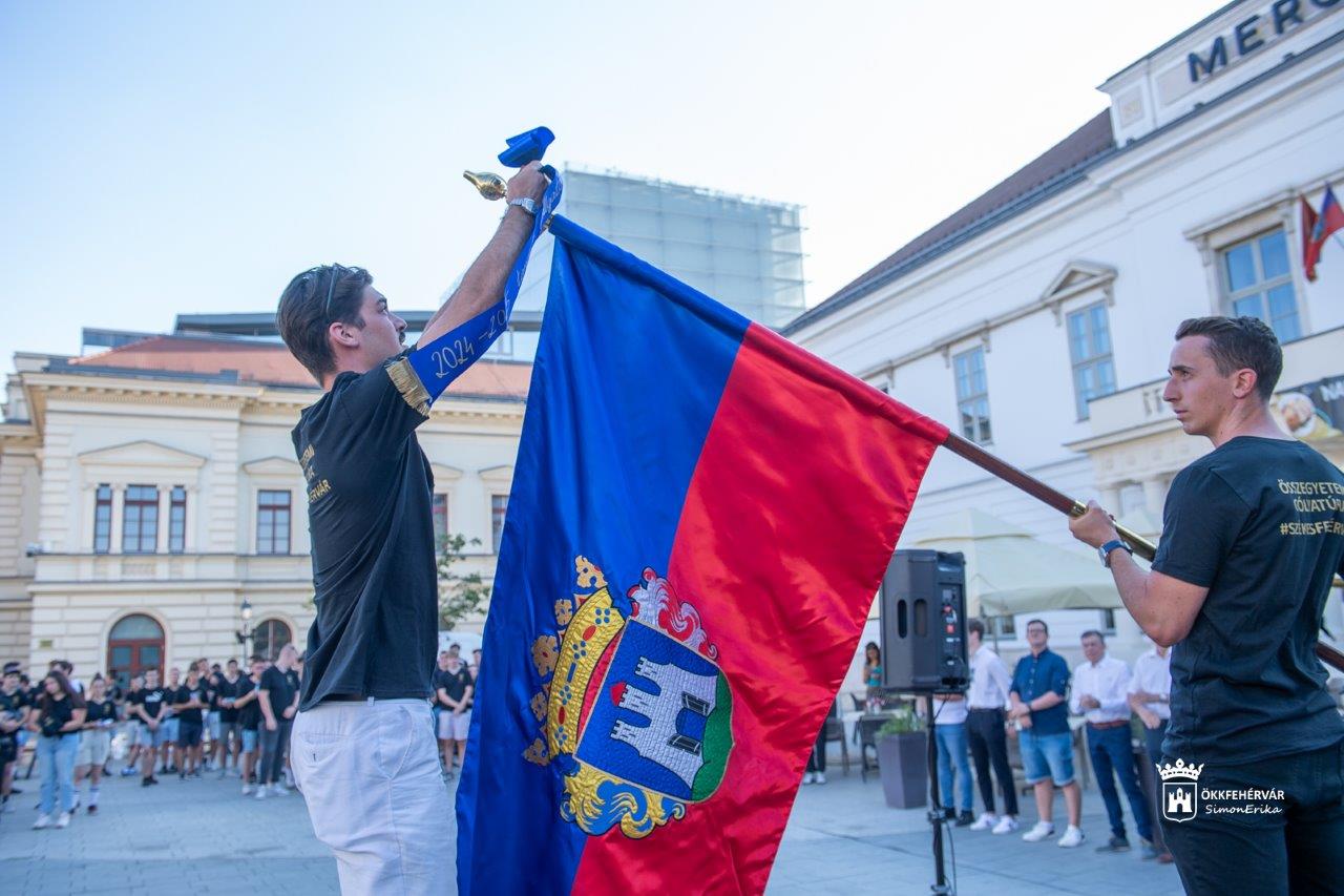 A köszöntők után a hallgatók képviselői tanulmányaik megkezdésének emlékére szalagot kötöttek fel Székesfehérvár zászlajára.
