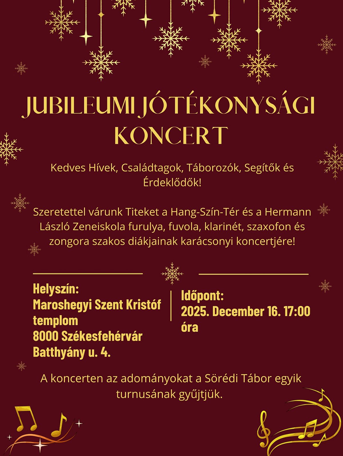 Szeretettel várnak minden kedves érdeklődőt a Hang-Szín-Tér és a Hermann László Zeneiskola furulya, fuvola, klarinét, szaxofon és zongora szakos diákjainak karácsonyi koncertjére a maroshegyi Szent Kristóf templomba 2025. december 16-án 17:00 órakor. A koncerten az adományokat a fogyatékkal élő felnőtteket táboroztató Sörédi Tábornak gyűjtjtik.