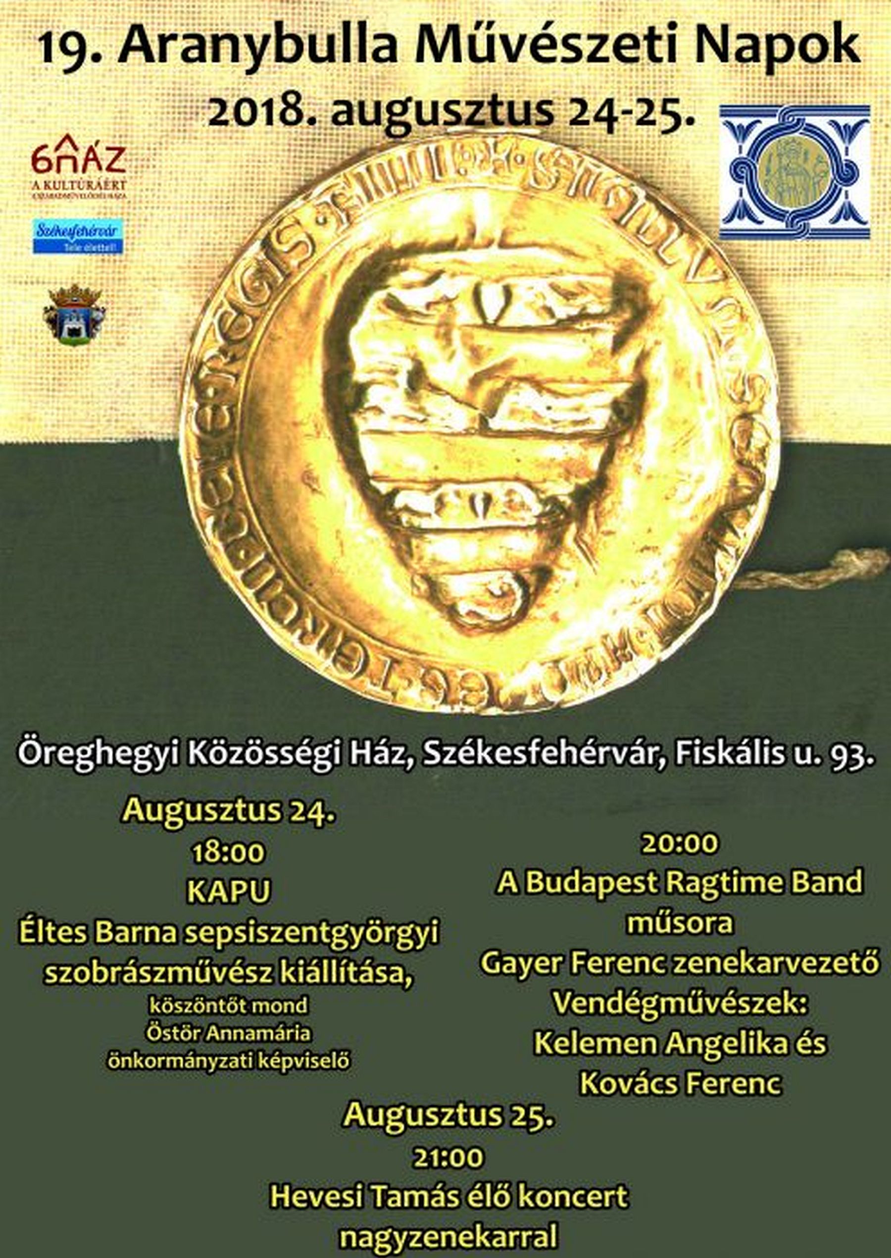 „A Ki válaszol? – Egymásra hangolva című est az Öreghegyi Mulatság rendezvénye lesz 18 órakor a Borok Pincéjében (Pánczél József pincéje): P. Maklári Éva és Bobory Zoltán egymás verseit mondják el, a rendhagyó programon Cserta Gábor működik közre a két szerző megzenésített verseivel. Mivel Szörényi Levente és a Vujicsics együttes koncertjét viszonylag hosszabb technikai szünet előzi meg, ezt áthidalandó ajánljuk a közönségnek ezt az irodalmi programot.” - emelte ki Kiss Dorottya, A Szabadművelődés Háza igazgatója, aki az augusztus 24-25-én, pénteken és szombaton rendezendő 19. Aranybulla Művészeti Napok programjairól is beszámolt.