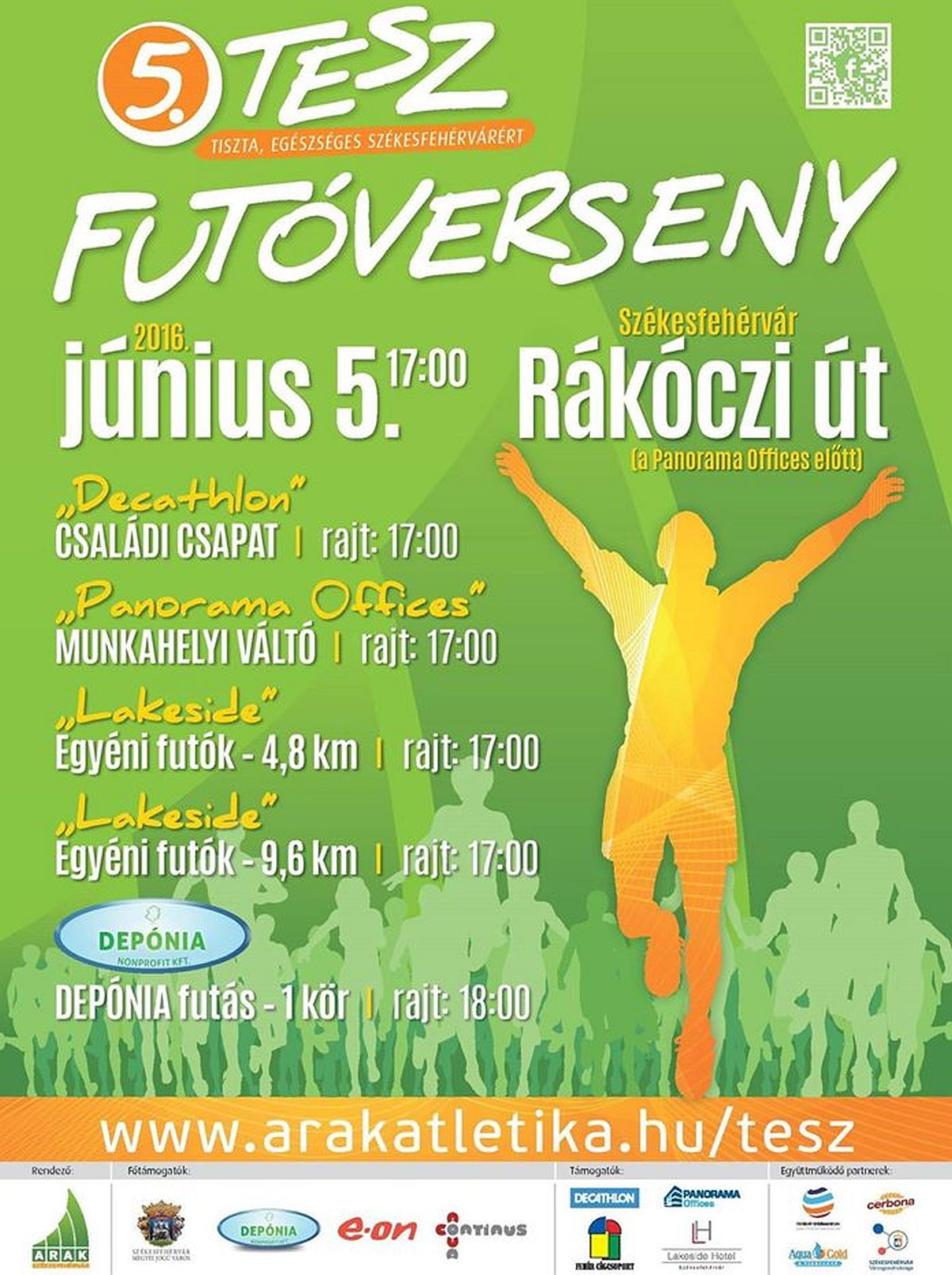 Az ARAK, Székesfehérvár Önkormányzata és a Depónia Nonprofit Kft. közös szervezésében megvalósuló V. TESZ futóverseny 2016. június 5-én, délután 17.00 órakor a megszokott helyszínről, a Panorama Offices irodaház elől indul majd. A szervezők az idei évben is több ezer résztvevőt várnak a rangos eseményre.