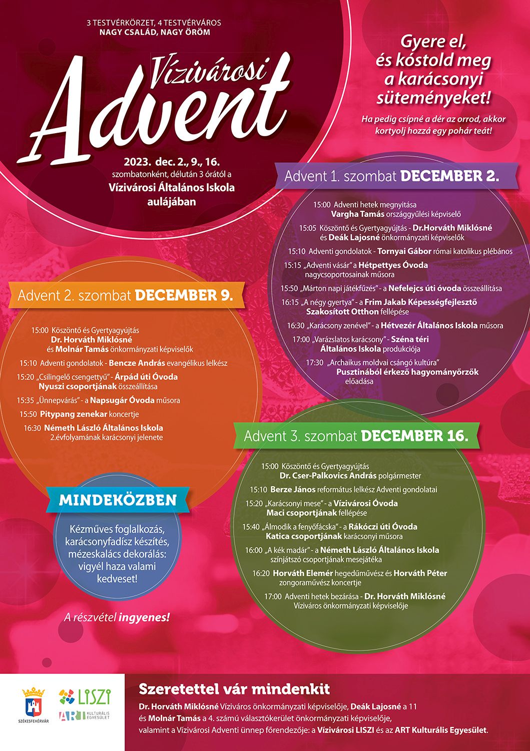 Dr. Horváth Miklósné, Víziváros önkormányzati képviselője hangsúlyozta, hogy minden évben igyekeznek egy meghitt, családias ünneppel meglepni a vízivárosiakat. Sajnos az elmúlt évek nem mindig kedveztek a rendezvénynek. Szerencsére idén ismét az iskolában tudják tartani a programsorozatot, ahol a helyi gyermekek fellépéseivel és remek műsorokkal várnak minden érdeklődőt nem csak a rendezvényt szervező városrészekből, hanem egész Székesfehérvárról.