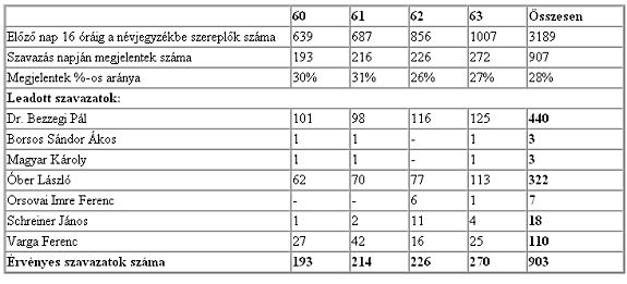 Törvényes keretek között zajlott Székesfehérváron a 13-as számú választókerületben az időközi önkormányzati választás vasárnap. A szavazásra jogosultak 28.3 százaléka adta le voksát, így összesen 903-an éltek állampolgári jogukkal. EREDMÉNY: Dr. Bezzegi Pál FIDESZ 440, míg Óber László FPE-MSZP 322 szavazatot szerzett a 13-as választókörzetben az időközi önkormányzati választáson. Varga Ferenc független jelölt 110 szavazatot kapott.
