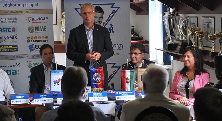 A sajtótájékoztató keretében írták alá a fehérvár klub vezetői az EBEL-meccsek televíziós közvetítéséről szóló szerződést a Sportklub csatornával.