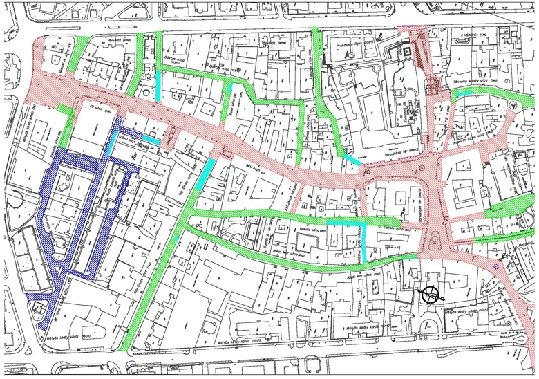 A gyalogos zónát piros, a szabad behajtást sötétkék, a korlátozott behajtást zöld, a kijelölt rakodóhelyet világoskék színnel jelöli a térkép.