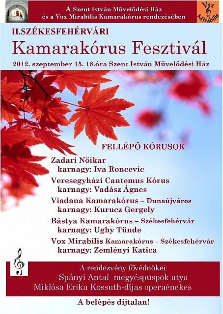 Második alkalommal rendezi meg a Fehérvári Kamarakórus Fesztivált a Vox Mirabilis kamarakórus és a Szent István Művelődési Ház. Szeptember 15-én (szombaton) a helyi és hazai kórusok mellett Zadarból is érkezik résztvevő együttes a találkozóra.