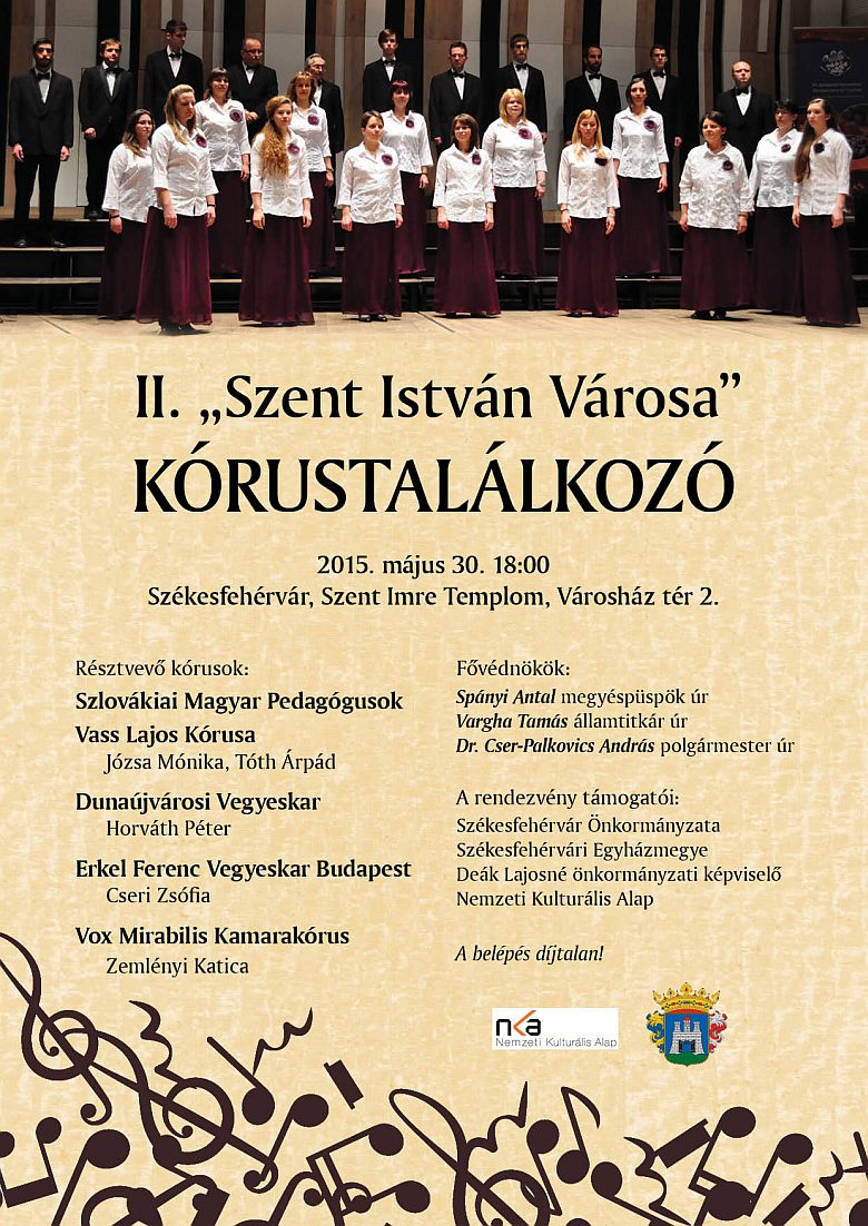 Szombaton, május 30-án a Szent Imre Templomban rendezik a II. Szent István Városa Kórustalálkozót, ahol neves kórusok mutatják be magas színvonalú egyházzenei műsorukat a fehérvári közönségnek, a koncert végén pedig Kodály Zoltán Ének Szent István Királyhoz című kórusművét adja elő az összkar.